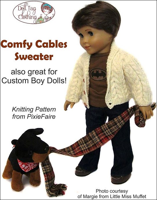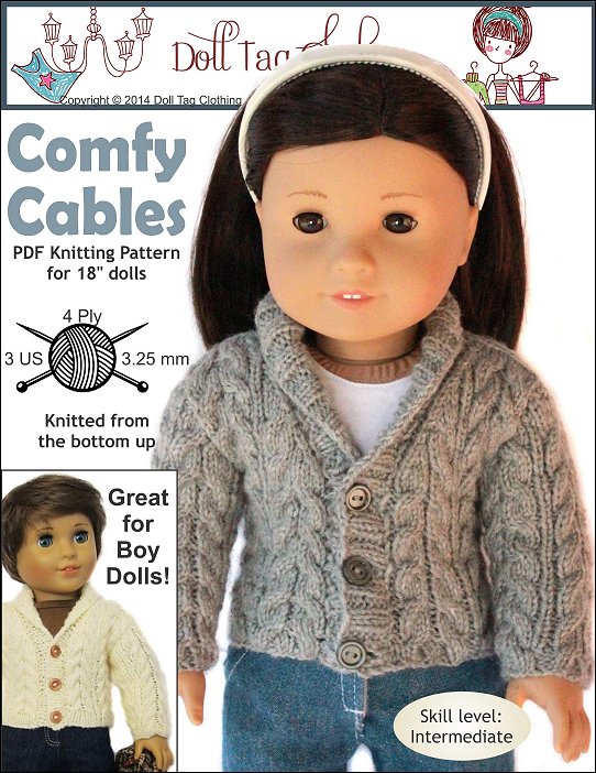 You can create a comfy cozy sweater for your doll with this fun knitting PDF pattern! This sweater is knitted in cables and is knitted from the bottom up. This classic sweater looks great on boy dolls too!Doll Size: 18 inch dolls such as Our Generation or American GirlYou Will Need: Yarn: 1 ball of 4 ply family knit. Needles: Set of needles in size US 3-1/4, crochet hook for neckline, 1 cable needle Notions: Stitch holder, 3 Buttons or Snaps