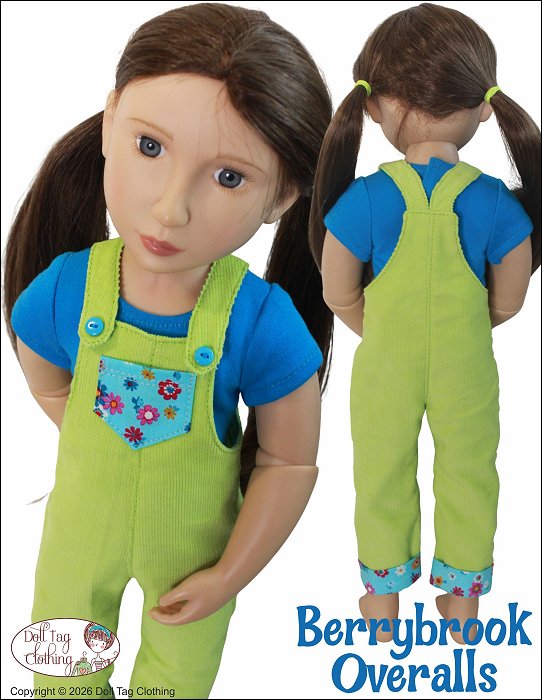 Sew overalls with a children’s vintage-inspired aesthetics. These overalls focus on charm with contrast details in the pocket and cuffs. Paired with your favorite t-shirt this design is playful and perfect for Spring or Summer.The overalls have a straight-leg fit with a fold over cuff at the hem. There is a matching pocket on the front. The pants have a front and back seam. The straps are shaped for the 16 inch doll’s shoulders for a better fit. The straps have a snap closure in the front for easy dressing.This pattern is well suited for beginners with simple straight line sewing.Pattern Features:* Front pocket* Shaped shoulder straps* Snap closure in the front* Flip up pants cuffsDoll Size: 16 inch dolls such as A Girl for All Time and Gotz Sasha