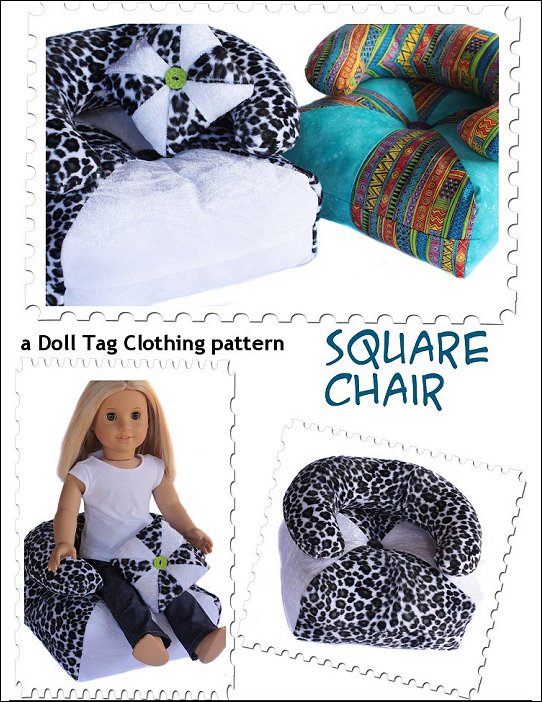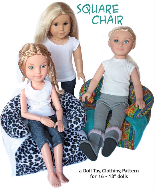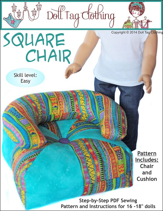 You can create a comfy square chair for your doll with this PDF pattern. Create various looks by selecting different types of fabrics. This chair can be made with or with out the back/arm rest for a more simple style. Your doll will be ready to chill and lounge around with friends with chairs made from this new doll furniture pattern.Doll Size: 16 to 19 inch dollsYou Will Need: -½ yard fabric-2 colors ¼ yard each - 2 Fat Quarters (Armrest in 2 Colors) OR 3 Fat Quarters in 2 Colors (Armrest in 1 color) -Stuffing (fiberfill) -2 Buttons -For Tufting: Extra length needle about 4" long (upholstery needle) -Fabric remnants for scatter cushion
