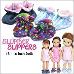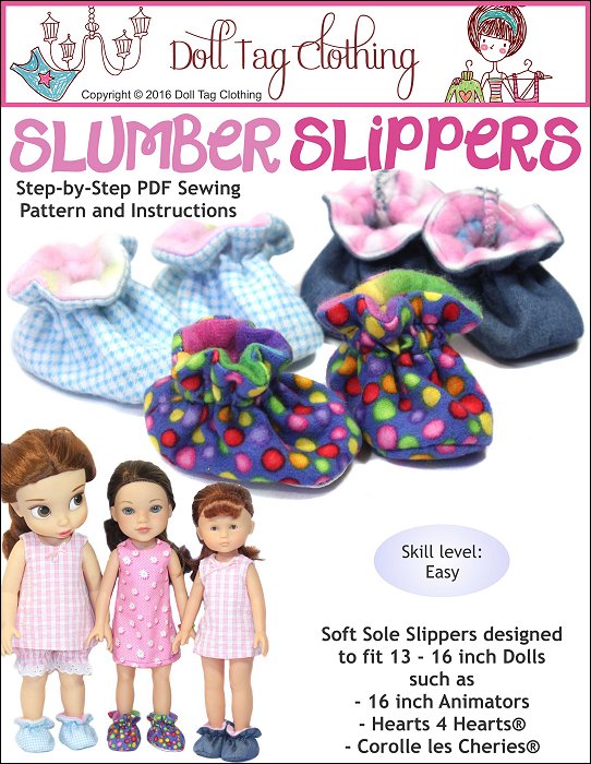 Cozy and comfortable slippers! These slippers have a soft sole with elastic around the ankle and are made completely on the sewing machine. Play with a variety of fabrics for different and cuddly looks. Use none slip fabrics for real looking soles. The PDF pattern contains two options for the back seam - exposed or enclosed. A lace trim option with pattern piece is also included.Doll Size:Variety of 13 to 16 inch dolls with a foot length of 1.75 to 2.25”The fit was tested and confirmed on the following dolls:-- Animators-- A Girl for All Time-- Vintage Sasha-- Heart for Hearts-- Corolle les Cheries-- Glitter GirlsDoes NOT FIT WellieWishersMaterials:Light weight denim; Fleece lining; Light weight corduroy; Thin fun fur; Flannel; Cotton; Crushed velvet; Minky - Optional: None slip fabric for solesYou Will Need:-Fabric – 8” x 11”-Lining – 8” x 8”-Fusible Interfacing – 8” x 11”-1/4” wide flat elastic – 5”More Sizes: Slumber Slippers for 16 to 18 inch Dolls - CLICK HERE