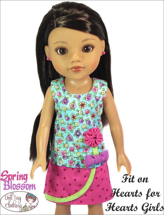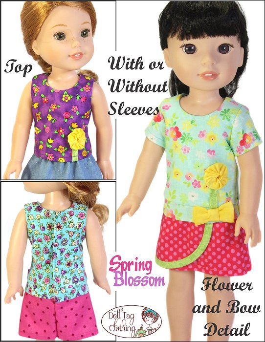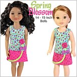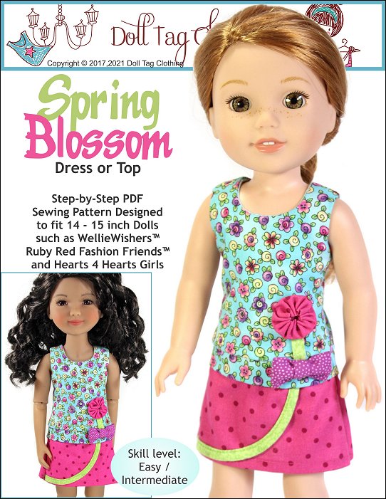 Let Spring blossom with this fun summer dress. Play with fabric and color for a variety of looks. This PDF pattern includes sleeves or can be done sleeveless. The sleeve version is not lined. The sleeveless version has a fully lined bodice. Don't sew on the skirt and you have a cute spring top. The flower and bow are sewn onto the dress by hand with a Velcro closure in the back.Doll Size: 14.5 - 15 inch dolls such as WellieWishers and Ruby Red Fashion FriendsAlso fits - Melissa and Doug Mine to Love.Hearts for Hearts Girls - Slightly loser in the bodice but looks good.Materials:•FABRIC CHOICE - Light weight woven fabrics. Quilter's cotton. Cotton.•LINING - Light weight woven fabric.You Will Need:•Fabric 1 - Bodice and Overlap - 14 x 22" or Fat Quarter•Fabric 2 - Skirt and Flower - 9 x 20" or half Fat Quarter•Fabric 3 - Binding, Bow and Flower Stem - 1 x 10"•Fabric 4 - Lining - 7 x 16" (or you can use the same fabric as for the top)•4" Hook and Loop