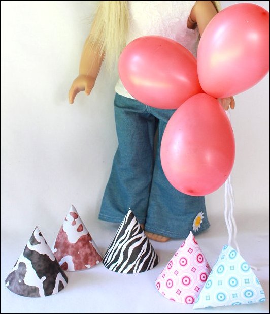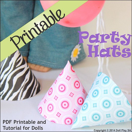 FREE Printable CraftMake these fun party hats for your dolls! Animal print theme and circle dots included.* 6 Printable party hatsBALLOONS:Water Balloons can be bought in the party section of most shops. These are the perfect size for dolls!HAT INSTRUCTIONS:1. Roll and overlap the grey area. Glue.2. You can use glue and a peg to keep the hat in place OR stick the hat together with sticky sellotape OR a stapler.3. Staple an elastic to the sides for a chin strap.