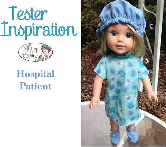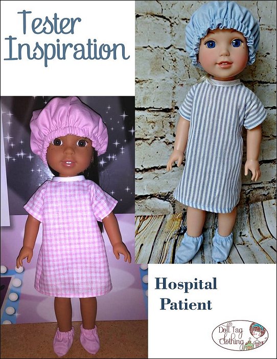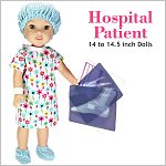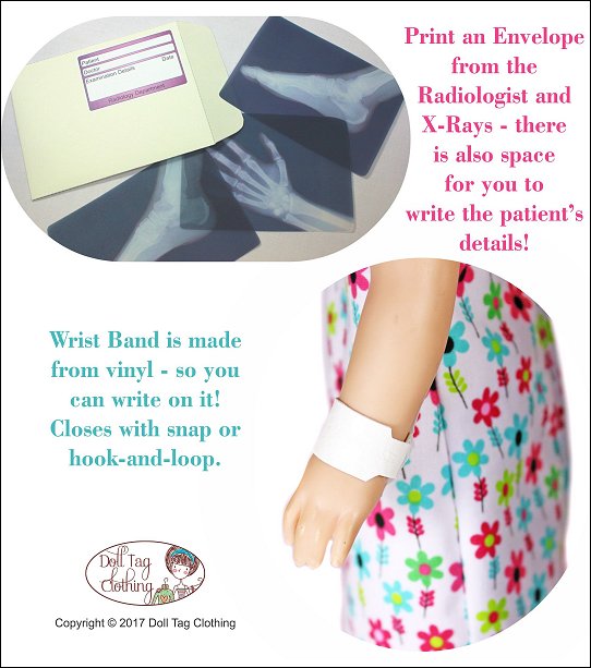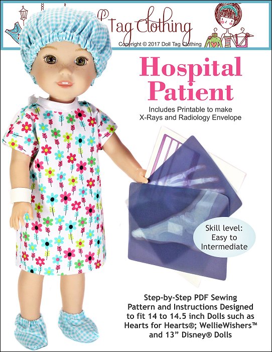 Your doll will become the cutest patient around with this adorable PDF pattern! This hospital gown is made with an overlap in the back that closes with hook-and-loop tape and bias binding ties so there is no wide open gap. If your doll needs to go to surgery she will also need a scrub hat and some booties! And don’t forget her wrist band for you to write her name on! It is made from vinyl and is so quick to make so you can make a few in a matter of minutes.There is also a fun Doll Play printable added! Print the X-Rays on Vellum paper or transparencies for a “real” x-ray look. The envelope is printed onto cardboard, folded and glued. There is space on the front for the patient's details to be written on.Doll Size14 to 14.5 inch dolls such as Hearts for Hearts® and WellieWishers™You Will Need:• Fabric 1 – Hospital Gown – 9” x 17”• Fabric 2 – Cap and Booties – 9” x 16”• Remnant of vinyl for wrist band• 16” Bias Binding• 1” Hook-and-Loop• 9” Narrow Elastic (1/4” wide)• 5” Narrow Elastic (1/8” wide)• Cardboard (cardstock) • Vellum paper