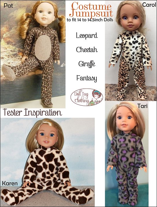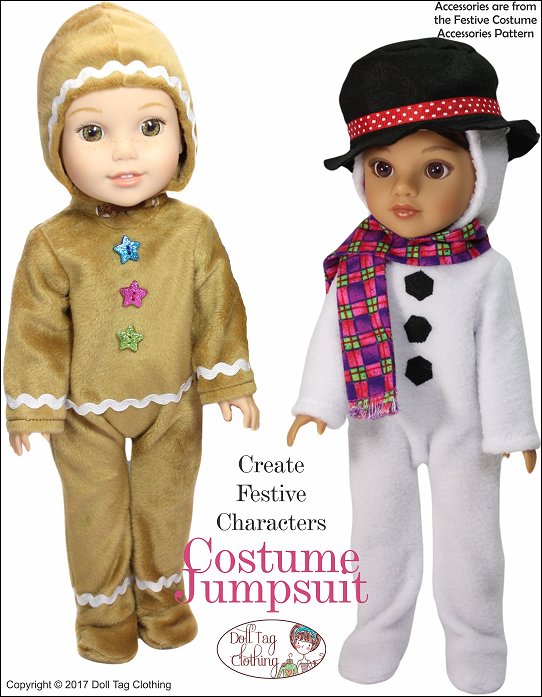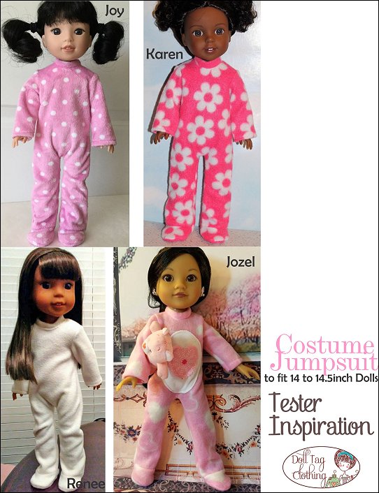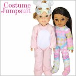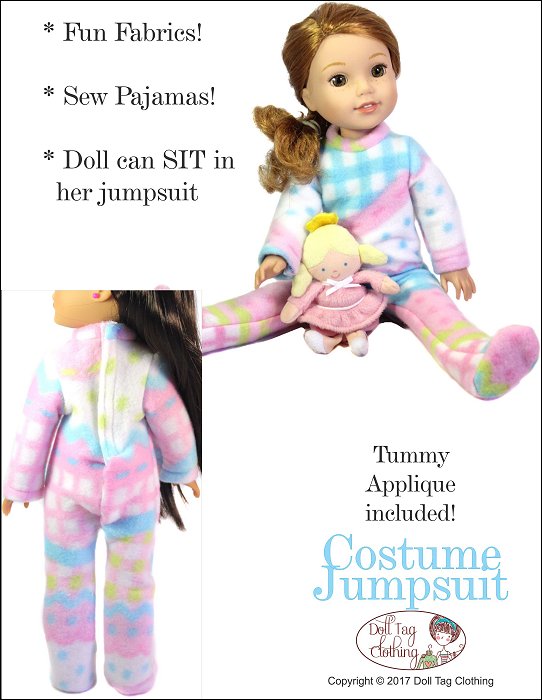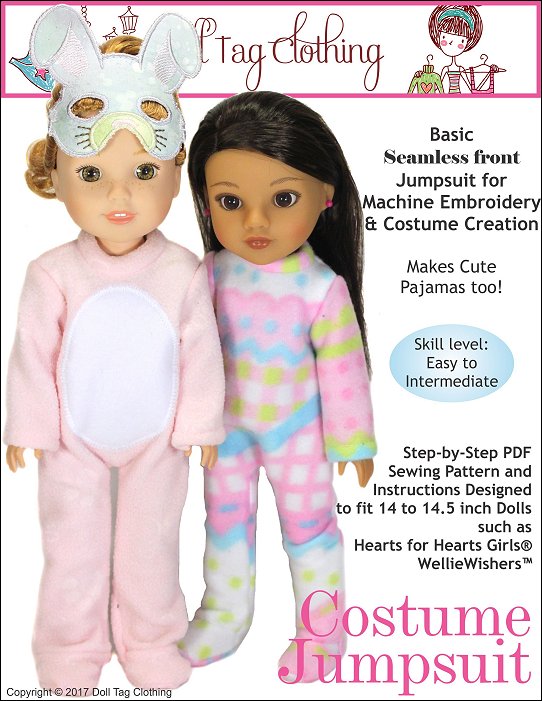 Looking for a fun yet simple pattern that can create a variety of costumes? This jumpsuit has that! This PDF pattern is for a seamless front jumpsuit with closed feet. Decorate the smooth front with appliqué or machine embroidery! Also ideal for vinyl transfers. Use cute fabric and you can make winter pajama's!Use the basic jumpsuit and add different elements to create different characters and critters.The jumpsuit closes in the back with hook-and-loop tape. The doll can sit in her jumpsuit.Instructions Include* Applique and template for a critter tummy. Your first step to creating a cute critter!* Adding a machine embroidery design to the front.* Working with fur.Doll Size:14 to 14.5 inch dolls such as Hearts for Hearts® and WellieWishers™Fabric GuideDesigned for fleece fabric. Fleece, polar fleece or fun fur. Minky or crushed velvet can also be used.You Will Need• Fabric — Jumpsuit• Hook-and-Loop tape – 3.5”• 1/4" sew-on snap• Fusible Interfacing• Fusible Web (for appliqué)