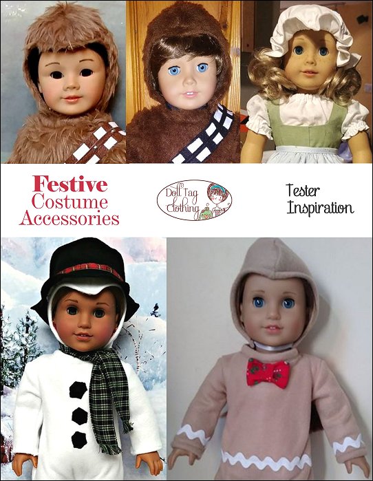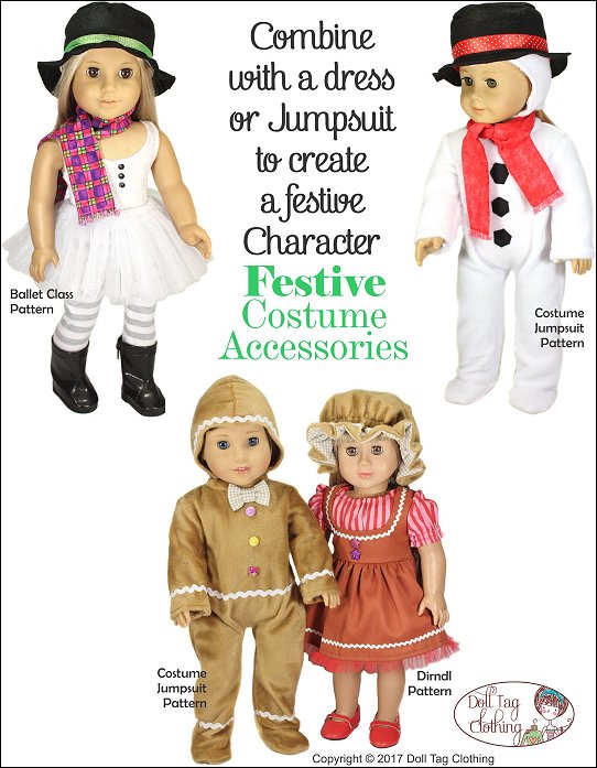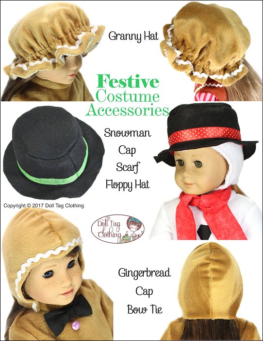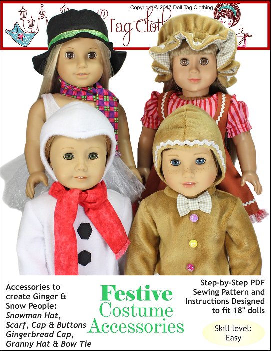 This PDF pattern includes accessories to create Snow and Gingerbread people. Add the elements in the pattern to your favorite dress or jumpsuit to create the different festive characters.Instructions are included to add applique "coal buttons" to a snowman suit or rick rack to a Gingerbread dress or suit.Elements included in this pattern areSnowman Cap, Hat and ScarfGingerbread Cap (boy), Granny Hat (Girl) and Bow TieDoll Size: 18 inch dolls like SA Girl Doll, Our Generation or American GirlFabric GuideFleece or polar fleece. Minky or crushed velvet can also be used.Granny Hat - Medium weight woven fabrics – Linen, Cotton, quilter’s cotton.Snowman and Gingerbread Cap – Fabric with a slight stretch works best such as fleece.Snowman Hat - FeltSnowman Scarf - Flannel You Will Need