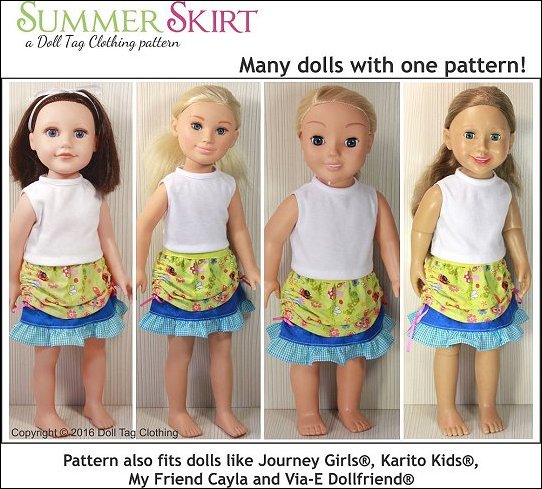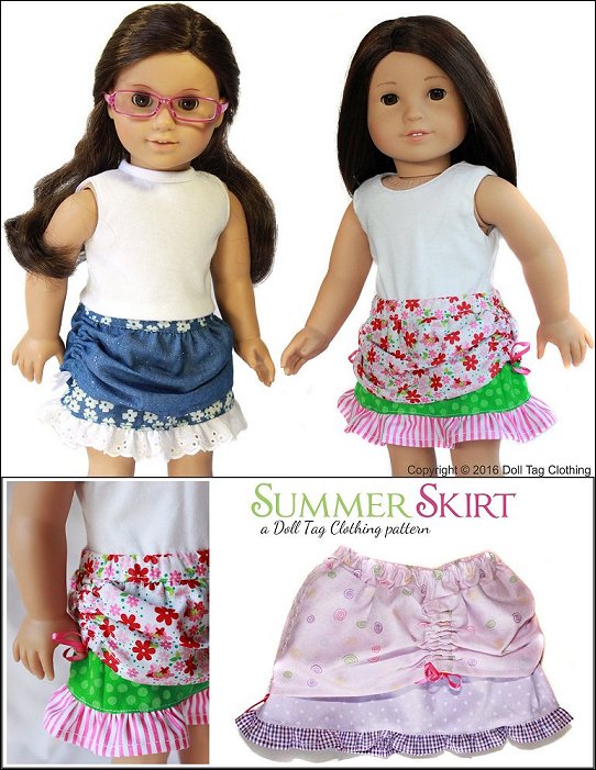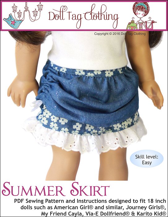 You can make a variety of different skirts in different fabrics and prints with the Summer Skirt PDF Pattern.Doll Size:18 inch dolls like SA Girl Doll, Our Generation or American GirlAlso fits - Journey GirlsĀ®, Karito KidsĀ®, DollfriendsĀ® by Via-E and My Friend CaylaYou Will Need: - 1/8 yard of two types of fabric plus a scrap for bottom ruffle- 1/4″ wide ribbon- Elastic