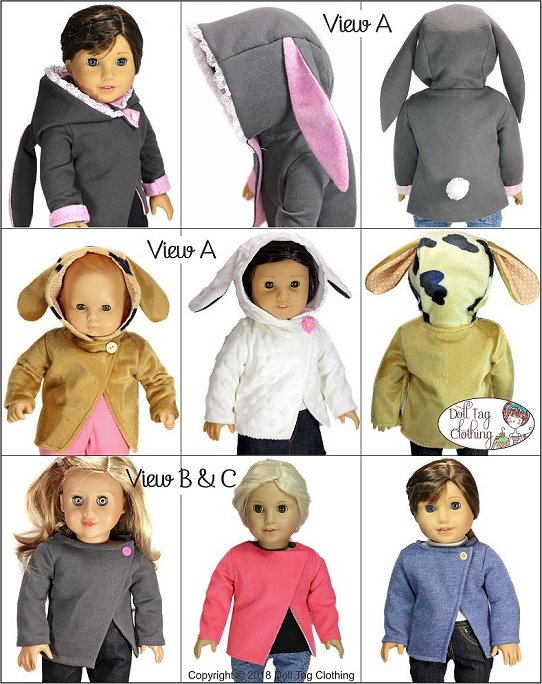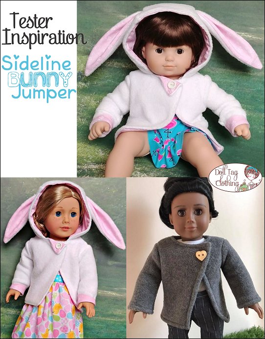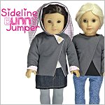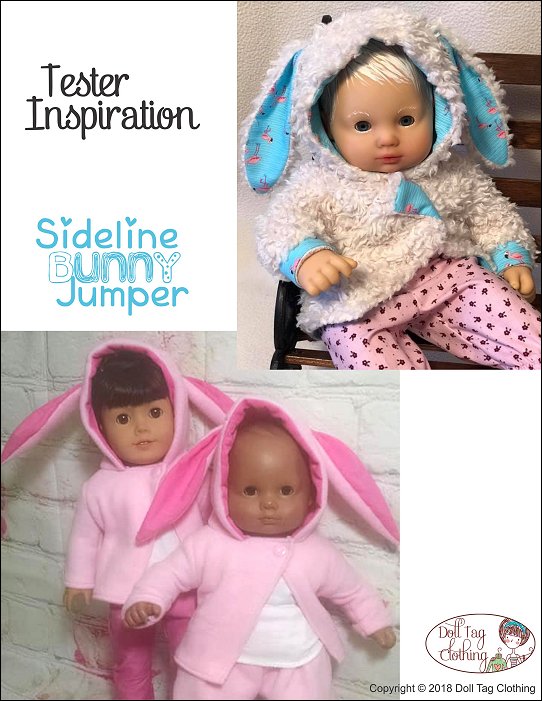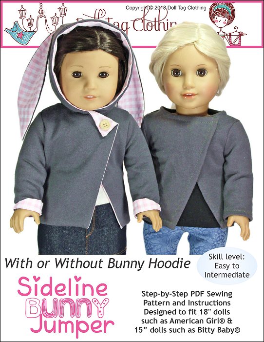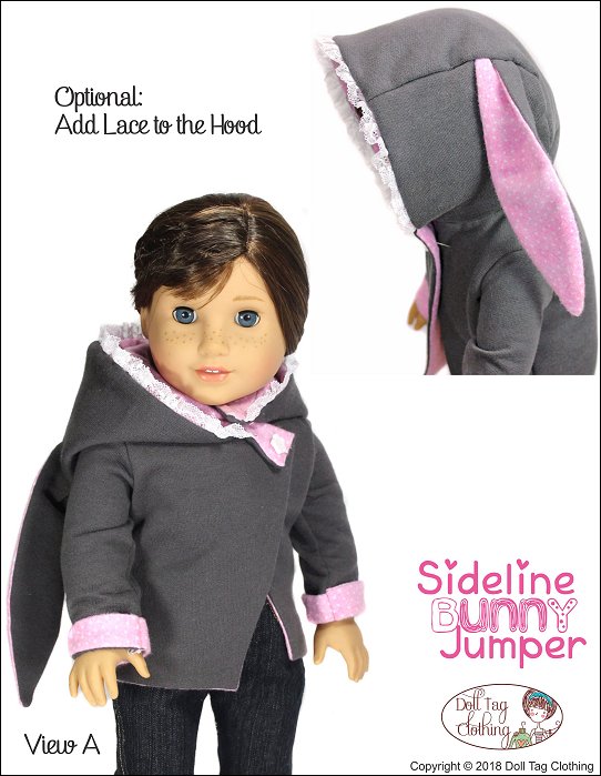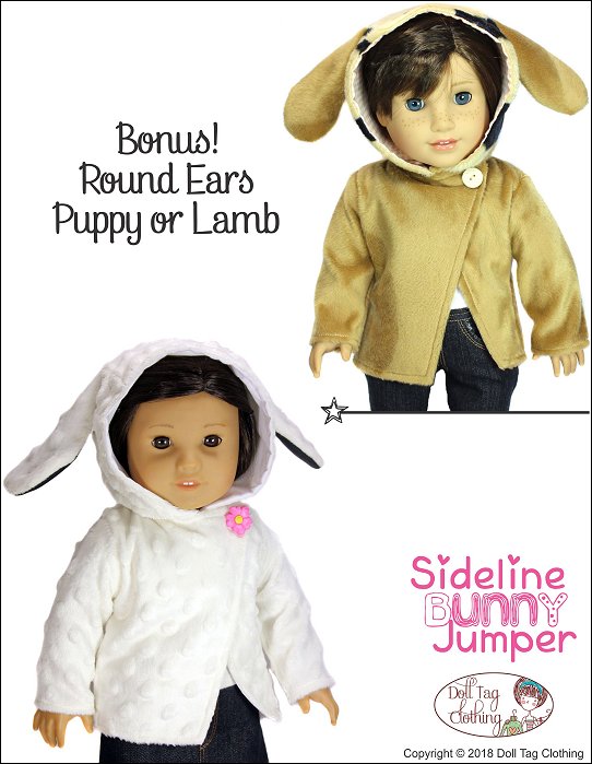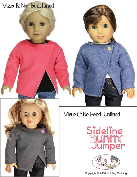 A modern and fun sweater style top that closes with a button and snap on the one shoulder. The sweater can be made with a bunny hood for a cute sweater that all girls will love. You can also use the round ear option to sew a puppy or lamb. The sweater back, front and hoodie is lined.For a simple sweater that sews up really quickly you can sew the sideline sweater without the hood. This is a great accessory to complete an outfit for winter or fall.Doll Size:18 inch dolls like SA Girl Doll, Our Generation or American Girl15 inch baby dolls like Bitty BabyFabric Guide:Medium weight sweater knitsMedium weight jersey knitLining — Polycotton, cotton, quilter’s cotton, seer suckerFabric with no or very minimal stretchYou will Need:A: Bunny Jumper Fabric — 13” x 41”A: Bunny Jumper Lining — 9.5” x 41”B & C: Sideline Jumper Fabric — 9” x 30”B: Sideline Jumper Lining — 9” x 19”1x Decorative Button — 1/4” to 1/2" wide1x Set Hand Sew Snaps — 1/4”Optional: Hoodie Lace — 5/8” wide – 30”Optional: Pom-pom for bunny tail