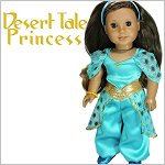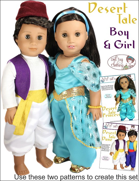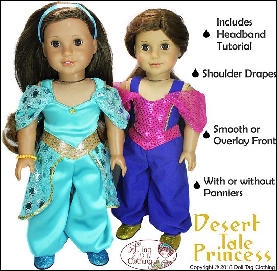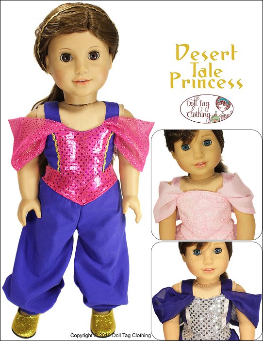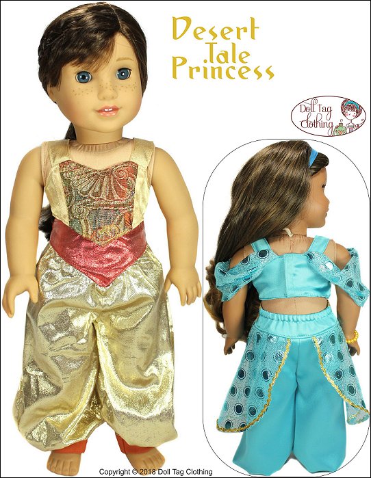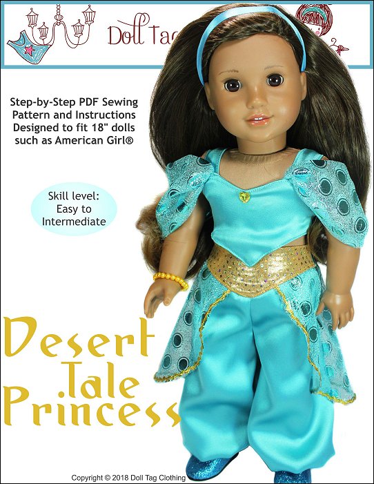 This PDF pattern is to sew and create an Arabian Princess inspired outfit.The crop top has a basque waistline. There is an option to add a contrasting color in the center of the top or just leave it plain.The top also has a sweetheart or rounded neckline. It has a hook-and-loop closure in the back.To add to the flair of the top you can either sew it with regular straps or add the shoulder drapes.The genie style baggy pants also have a yoke that has a basque shape. The pants has elastic inserted in the back. This is for easy dressing and doll play as well as fits various waistline sizes.Add panniers to the pants for an added Princess look.Doll Size:18 inch dolls like SA Girl Doll, Our Generation or American GirlFabric Guide:• Medium weight WOVEN fabric. • Bright and fabric with shine really makes this outfit sparkle!• Brocade, taffeta, chiffon, organza, satin and bridal satin, ‘Lame’ (metallic look), lace, lining, cotton • Shoulder drapes and pants panniers — Soft, draping fabric such as chiffon or dance meshYou will Need:Main Fabric — 11” x 35”Shoulder Drapes and Pannier Fabric — 8” x 33” (for chiffon 15” x 33”) Ribbon or Rick rack — 1/4” wide — 7” (Top) and 34” (Panniers)Elastic — 1/4” wide — 5”Hook-and-loop Tape — 2”