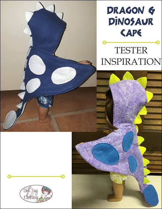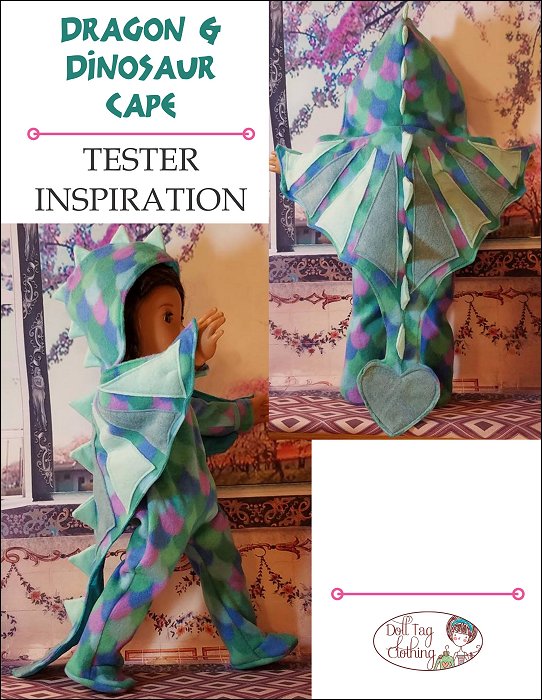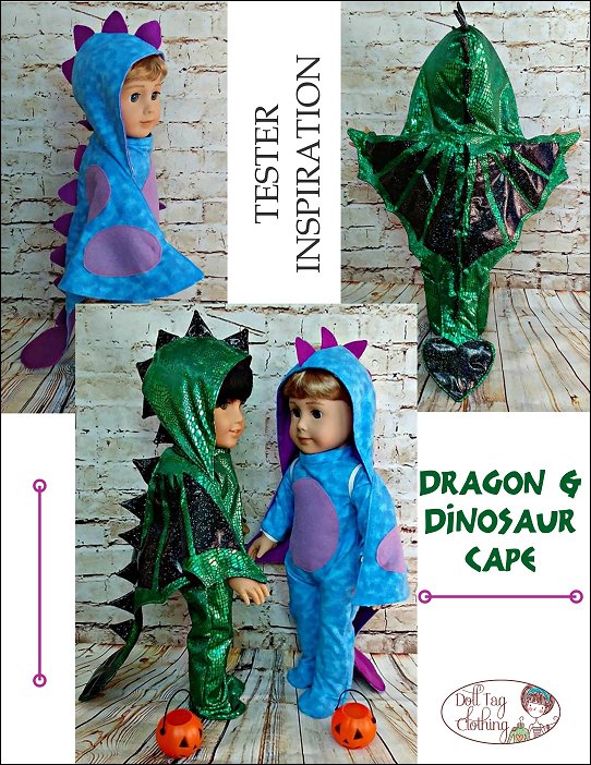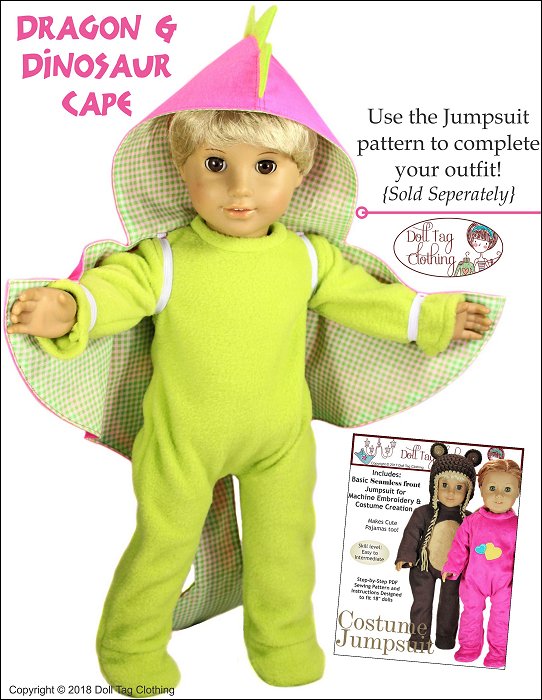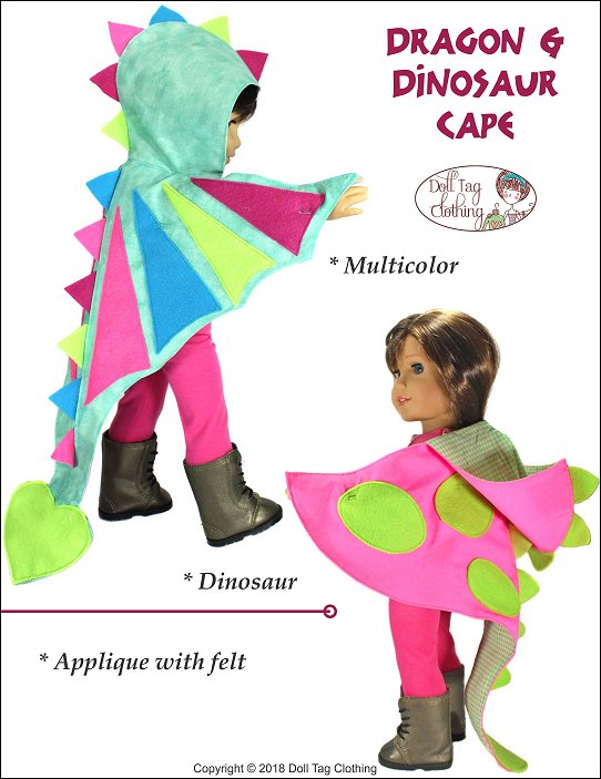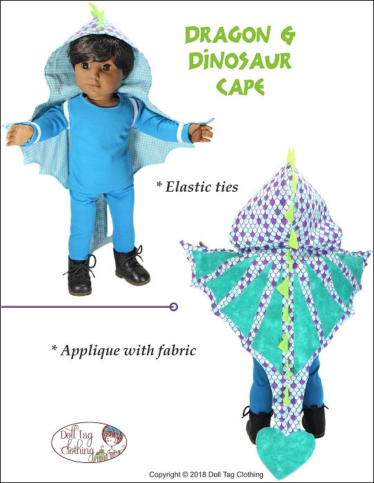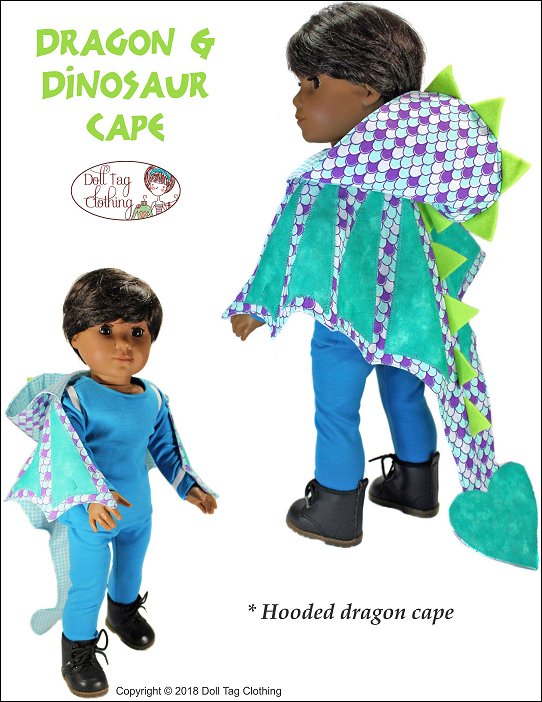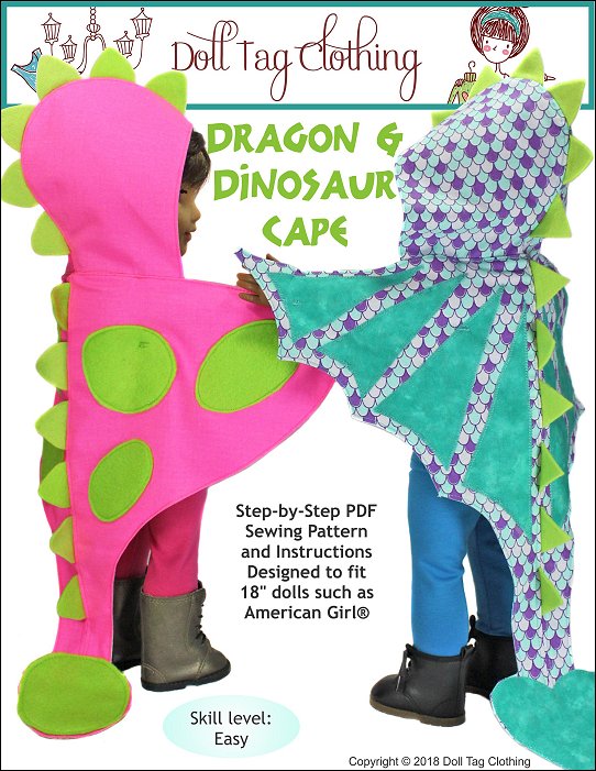 Does your doll love fantasy play? With this pattern you can create a Dragon or Dinosaur hooded cape. The cape has elastic ties that go over the doll's shoulders and wrists for easy dressing and also gives movement during play. The cape is finished with applique shapes on the wings and tail to provide character, as well as spikes down the back. Applique instructions are included. The cape is fully lined.There are two cape options included. The Dragon has pointed wings and spikes and a heart shape tail whereas the Dinosaur is rounded with round spikes and a club shaped tail.Size: Fits 18 inch dolls of various shapes and sizes.Fabric Needed:Light to Medium weight woven fabrics – Cotton or quilter’s cottonFor Appliqué — Felt or Medium weight woven fabrics — Cotton, quilter’s cottonYou Will Need:Fabric — 17” x 20”Lining — 16” x 20”Felt/Fabric Dragon Wing & Tail Appliqué — 7.5” x 19.5”Felt/Fabric Dinosaur Wing & Tail Appliqué — 4” x 21”Felt for Spikes (single layer) — 5” x 6”OR Fabric for Spikes (double layer) — 8” x 11.5”Fusible web or Appliqué paper — 9” x 18”1/4” Wide Elastic — 14.5”