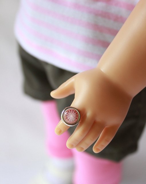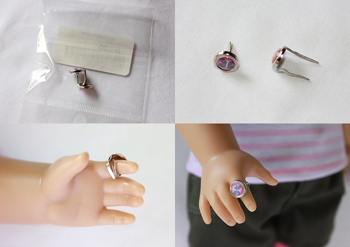 FREE Craft InstructionsI was walking through our craft shop and saw these cute things called 'BRAD PINS'... they use them for scrapbooking.They were so cute and there are so many to choose from!So I made a doll ring! All you need to do is separate the 2 metal 'bars' at the back of the pin. Then gently fold and fit it around the doll's fore-finger.