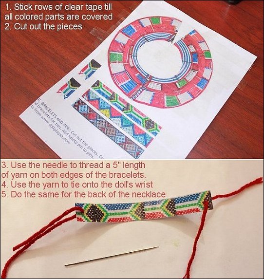Make a travel and souvenir set for your dolls:You will need:•Printable pages with beaded patterns, facts and map – download as a 2 page PDF file•Clear tape and glue stick•Scissors•Sewing needle with large hole for yarn•Yarn•Small safety pinBracelets, necklace and bead pin:Beads are a big part of most of the African cultures.Make a necklace and bracelets that look like bead work. The bead pin is the South African flag.Map and Book of Facts:If are going to travel you need a guide book and a map.Fold the book according to the photos.Stick down with glue stick to complete your book.