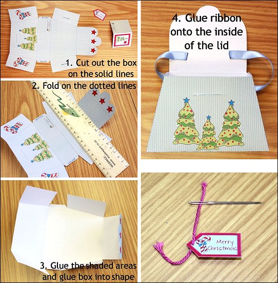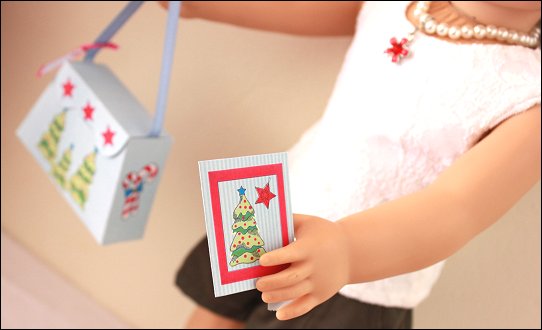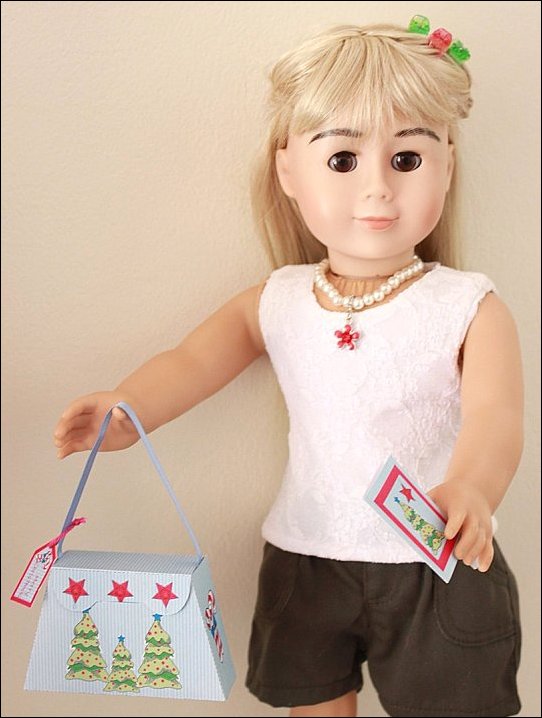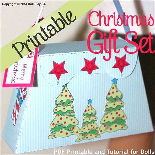 FREE Printable CraftCreate a festive Gift Box for your doll. The set includes matching gift card, gift tag and ornaments.Box / Purse Instructions:1 – Download and print the PDF for the gift box, tag, mini card and ornaments2 – Cut out all the pieces. Cut out the box on the solid lines. Cut open the slit on the front of the box3 – Fold the box on the dotted lines4 – Put glue onto the shaded areas5 – Fold and glue the box into shape6 – Cut a piece of ribbon 5” long and glue onto the inside of the lidGift Tag and Ornament Instructions:Step 1 – Add string to the gift tag or ornaments using a hand needle to stick it through.