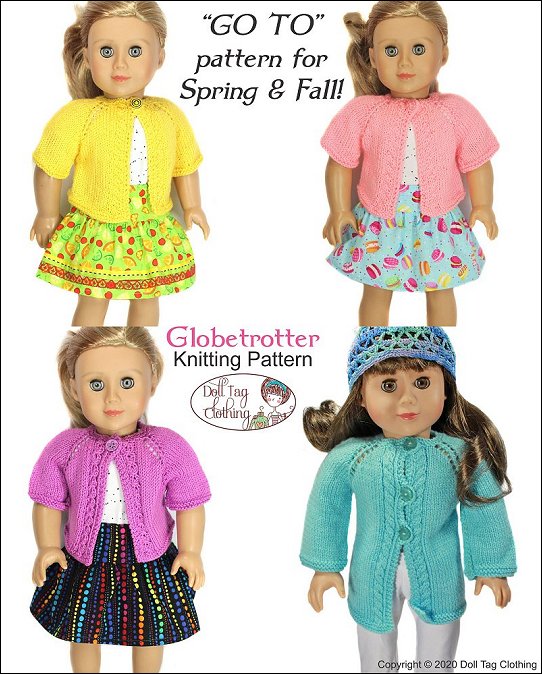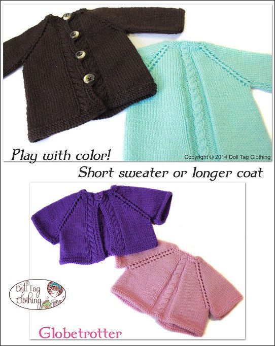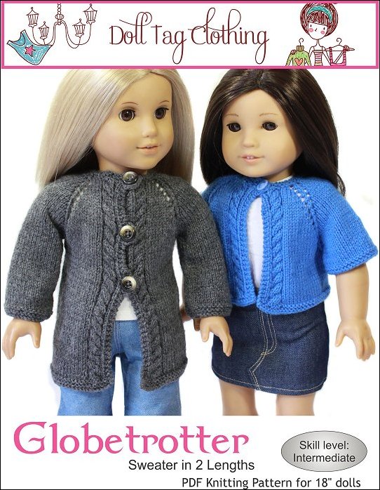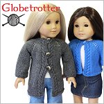Knit a swing style sweater or coat for your doll with the Globetrotter Sweater PDF Pattern from Doll Tag Clothing. The pattern is finished off with cute cables down the front and a cable row in the center back. The sweaters are knitted with 4 needles or circular needles from the neck down. Only the sleeve inner seams are sewn closed by hand.Doll Size: 18 inch dolls such as American Girl®, South African Girl Doll© and Our GenerationYou Will Need:-4 ply yarn – Sport Weight – (Baby Yarn) -25 gr for sort cardigan and 50 gr for jacket/coat-Size 3 USA (11 UK/Canadian), (3.25mm) OR use circular needles of the same size