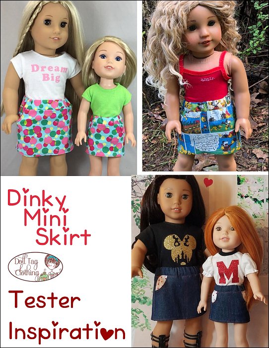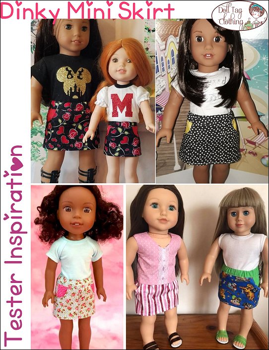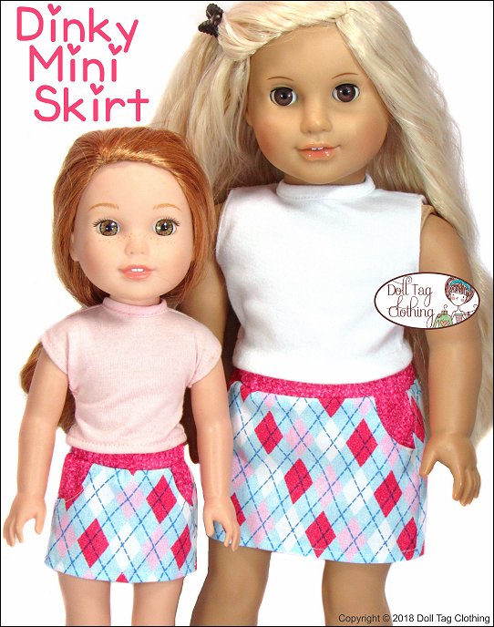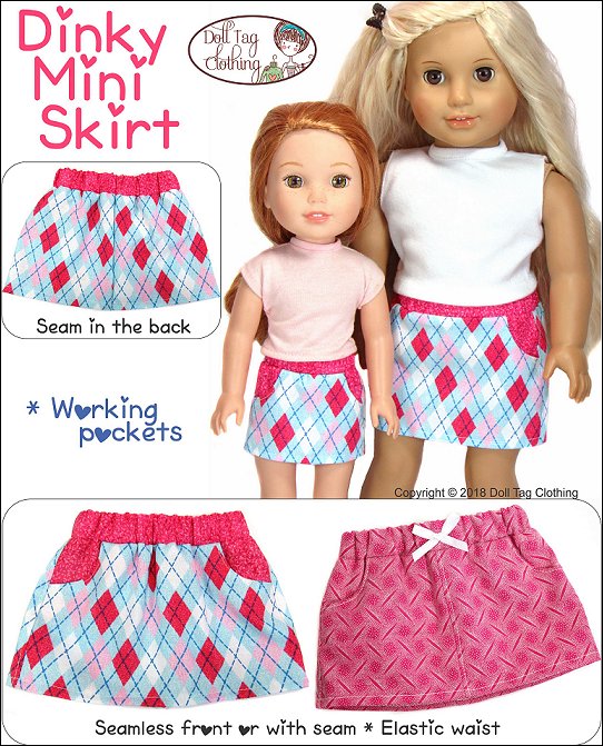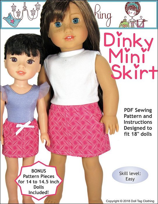 This is a fun mini skirt and ideal to use up scraps of fabric. It has a seam in the front and back as well as two working pockets in the front. The pockets can be made from contrasting fabric for added fun! The elastic waistband makes that this pattern fits a variety of doll sizes.I have also added a plain front option if you do not want to have a seam in the front to display pretty fabric.Size Fits:18 inch dolls such as American Girl14 to 14.5 inch dolls such as WellieWishers and Hearts for Hearts