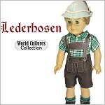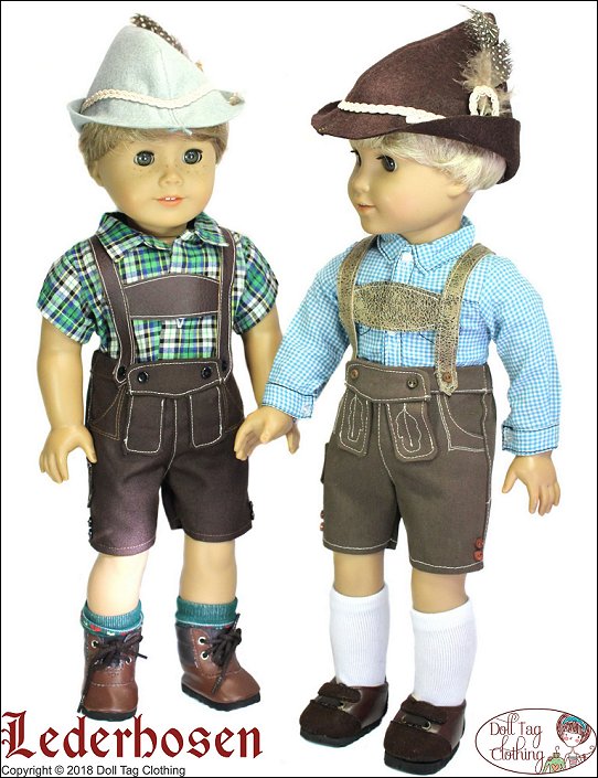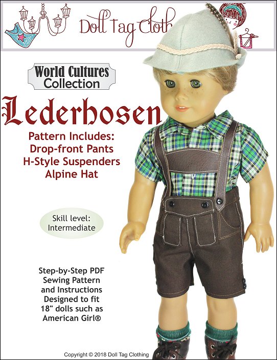 The German word Lederhosen means “Leather Breeches”. Originally these pants were commonly worn as work wear for hard physical work across central Europe. Today they are worn as leisurewear and considered traditional folk costumes in regions like Bavaria and Austria. They are also seen at Oktoberfest events across the world. Lederhosen have become a symbol of regional pride in Bavaria and other areas where they are worn.With this pattern you can sew your doll his own Lederhosen with H-Style suspenders and a felt Alpine hat.The pants have a drop front flap and two working pockets in the front. There is a single side pocket. I have simplified the pants for it to be more practical for doll size and easier doll play.The area for embroidery is very small on these doll size pants. You can add hand or machine embroidery to the front flap and pants front. An instruction for this is not included.Pair the outfit with white or green socks, brown leather look shoes and a white or check button up shirt.Dolls Size: 18 inch dolls such as American Girl
