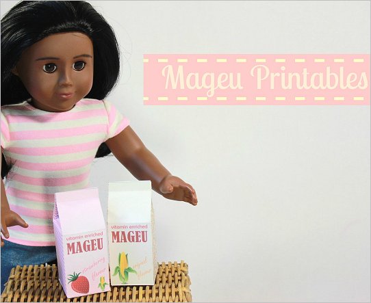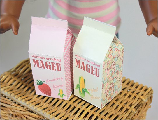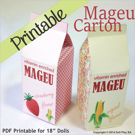 FREE Printable CraftMageu is a South African traditional drinkHere is a description from our friends at Wikipedia:Mageu (Sotho language spelling), maHewu, amaRhewu (Xhosa spelling) or amaHewu (Zulu spelling) is a traditional South African non-alcoholic drink among many of the Sotho people and Nguni people made from fermented mealie pap. (corn porridge like gritts in the USA) Home production is still widely practised, but the drink is also available at many supermarkets, being produced at factories. Its taste is derived predominantly from the lactic acid that is produced during fermentation, but commercial mageu is often flavoured, much in the way commercially available yogurt is. Similar beverages are also made in other parts of Africa.- Create 2 Flavors Mageu cartons for your doll.- Print on card stock