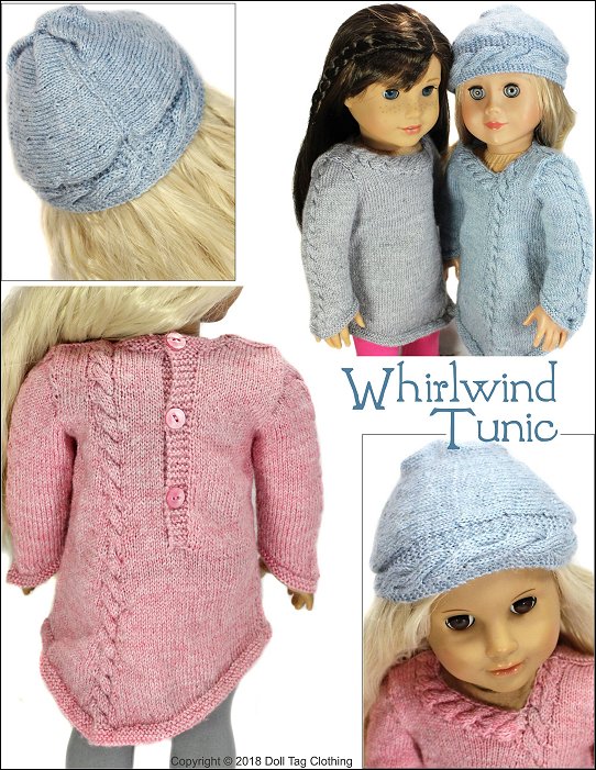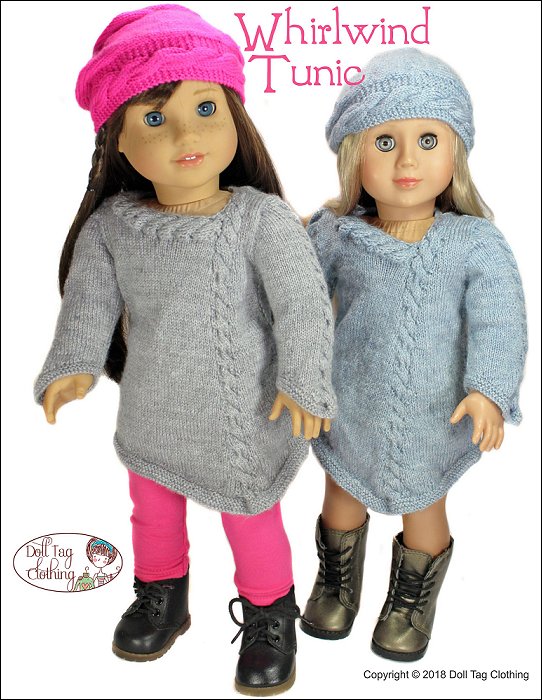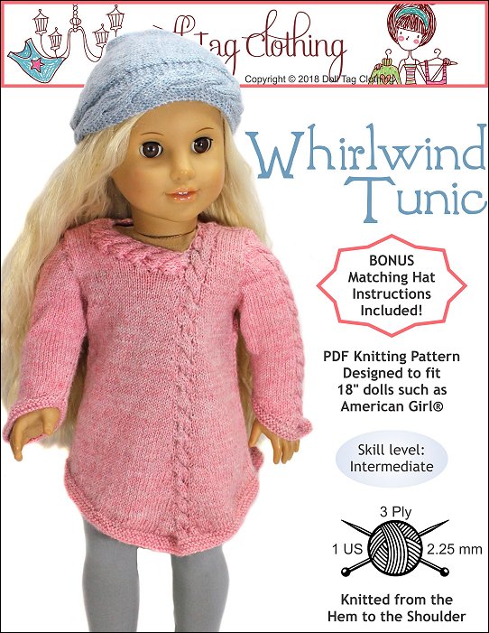 Gorgeous knitted tunic for winter or fall.With this PDF knitting pattern you can create a tunic with an asymmetrical hem and neckline. This same hemline is repeated on the back panel. There is a cable line running down the front and back as well as on the sleeves. The sleeve hem also ends in a cute point.The tunic closes with buttons in the back.Skill Level: This pattern is for intermediate knitters with a knowledge of cables. It is a slow and careful knit but the result is beautiful!BONUS: Included is a matching hat pattern with the same cable as in the tunic.Doll Size: 18 inch dolls such as American GirlYarn options:Elle® Babykins 3 ply — Pink, Blue, GrayKnitPicks® Stroll Brights — Bright PinkYarn needed:1x 50gr for dress only2x 50gr for dress and hat • Straight Needles — Size 2.25mm (US 1)• Double Pointed Needle• 3/8” Wide Buttons — x3