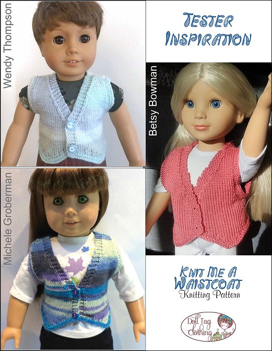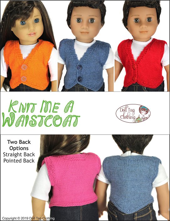 Any season, this is a fun waistcoat to prep up your outfit!With this PDF knitting pattern you can create a waistcoat with a pointed front hemline. The waistcoat closes with two buttons in the front. Also included is boy and girl options for buttonhole placement (left or right). There are two options for the back, straight or pointed.This pattern knits with 4 ply sport weight yarn and works quite quickly.Doll Size: 18 inch dolls such as American GirlYarn Options* 4 Ply — Sport Weight YarnElle Family 4 ply — Orange, Denim blue, RedKnit Picks Comfy Sport, 75% Pima cotton, 25% Acrylic — Peapod (green)Knit Picks Shine Sport, 65% Pima cotton, 40% Modal — Cosmopolitan (pink)You Will Need• Yarn Amount — 1x 50gr• Needles — Size 2US (2.75mm)• Stitch holders — 2x Small; 1x Larger• Buttons — 3/8” to 1/2" Wide – x2