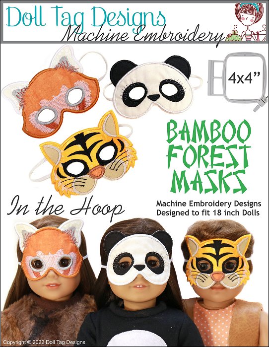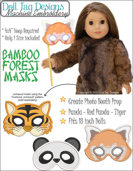 MACHINE EMBROIDERY DesignsThese machine embroidery masks are perfect for a dress-up theme! Add a cute jumpsuit and you have a full critter!The masks are completed in the hoop and elastic is added afterward with a sewing machine or by hand.Includes:Critter Masks to embroider in the hoop for your 18" Doll or all medium sized dolls.Giant Panda, Red Panda and Sumatran TigerDesign Hoops and Sizes: 4x4" Hoop NeededGiant Panda - 2.8 x 3.93 inchesRed Panda - 3.09 x 3.99 inchesSumatran Tiger - 2.87 x 3.93 inchesMachine Formats: ART5; DST; EXP; HUS; JEF; PES; VIP; VP3; XXX