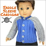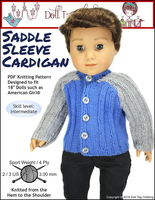 Knitting pattern to create a saddle sleeve cardigan for your 18 inch doll. The sleeves are knitted in a contrasting color for a trendy look. The sweater closes with buttons in the front.Doll Size: 18 inch Dolls such as American Girl®Skill Level — Intermediate to Experienced KnitterYarn Options:* 4 Ply — Sport Weight YarnElle Family 4 ply — Red/white; Denim blue/grey; Dark blue/whiteKnitPicks Stroll Brights — GreenYou Will Need:• Yarn Amount — 1x 50gr• Needles – Size 3mm (2 or 3 US) Straight• 5x Buttons — 3/8” Wide