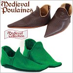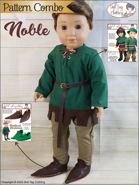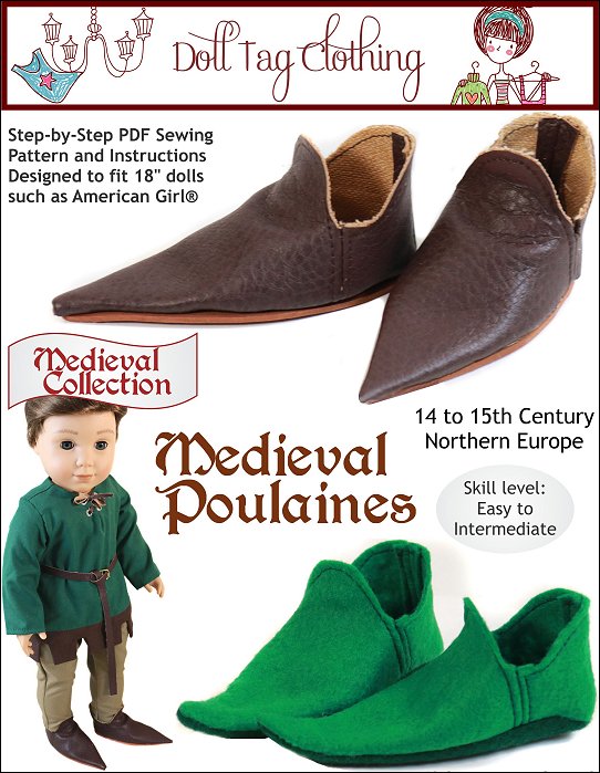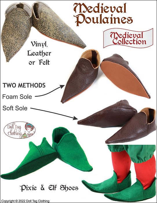 Get your doll ready for the Renaissance Faire with this medieval shoe pattern inspired by sharp pointed shoes worn by noblemen in the 14th and 15th century.Every person who could afford shoes wore poulaines, though the longer tips were generally reserved for nobility who could afford to wander around in footwear seemingly designed for pratfalls.They were low-cut, flat-soled, slip-on shoe- sometimes fastened with a side lace or toggle. The poulaines distinctive feature was its very pronounced, pointed toe.These shoes from the Middle Ages were also being cut to show off the colored hose around a lord’s ankle. In this time, tunics were getting shorter and young men would have been showing off their legs.This pattern will guide you to create a pair of poulaines. Two methods are included:1. Soft Sole — You completely sew the shoe on the sewing machine and turn once complete.2. Foam Sole — The top of the shoe is completed and then glued onto a foam base.Doll Size: 18 inch dolls such as American Girl®YOU WILL NEEDFoam Sole ShoesVinyl or Felt — 4.5” x 9”2mm (1/8”) Craft Foam or cork — 3.5” x 8”Soft Sole ShoesVinyl or Felt — 5x5” x 13”GluePins or grip clips