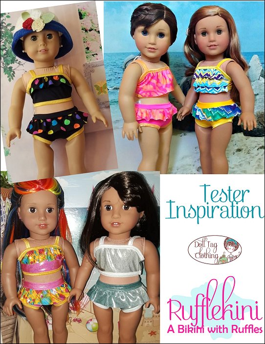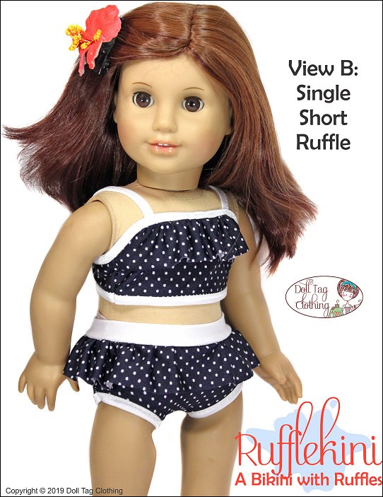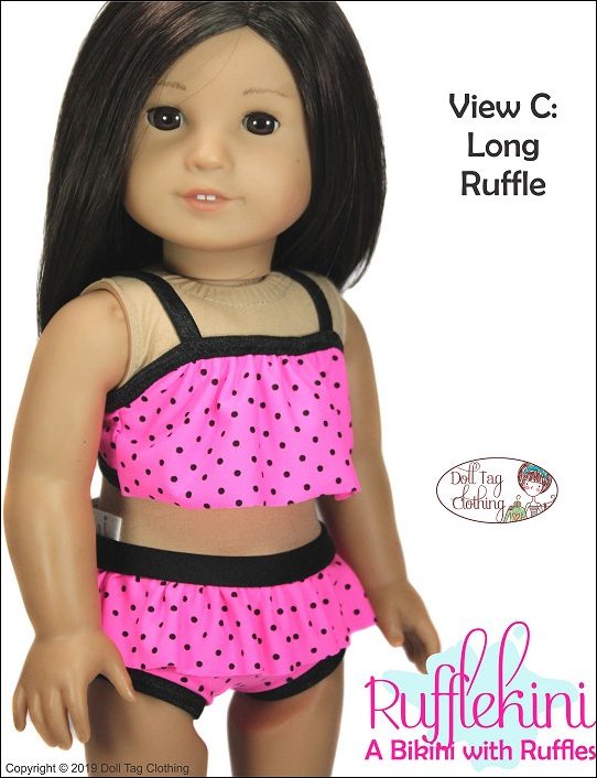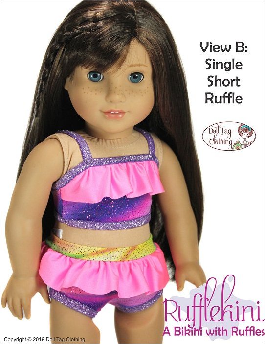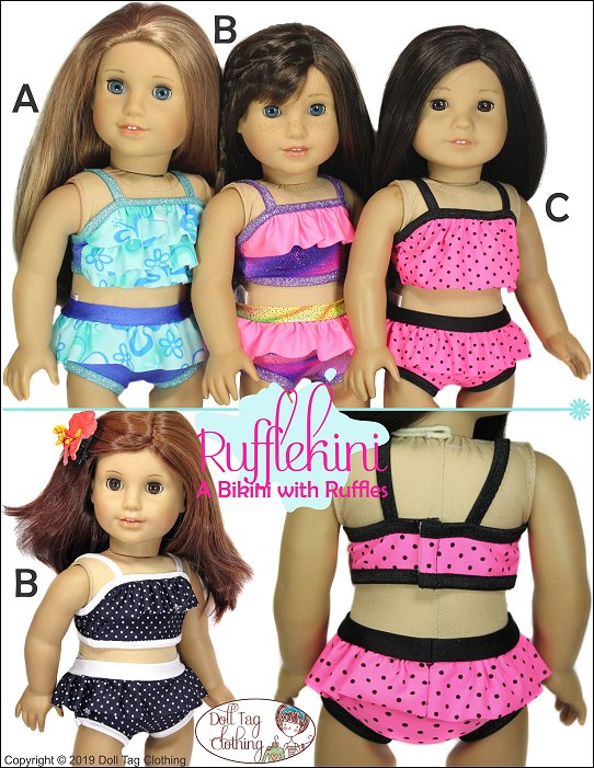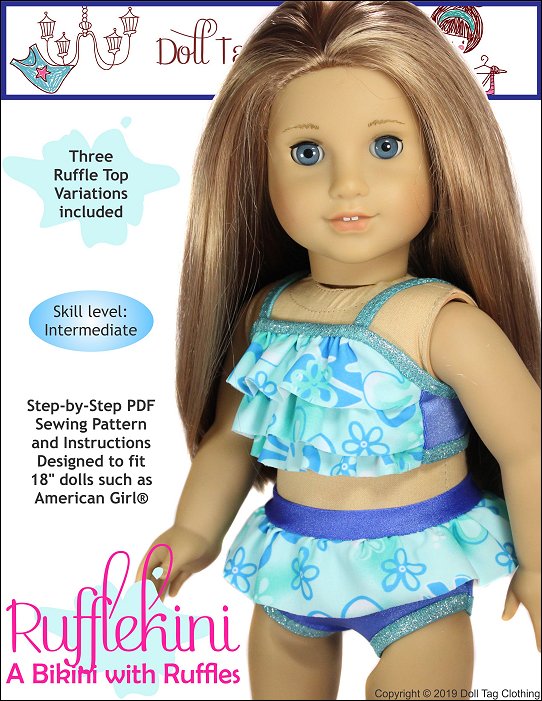 Trendy ruffle bikini for Summer fun! Beach or pool… with this swimsuit she will stand out from the crowd!Sewing pattern is created to fit your 18 inch dolls. The swimsuit consists of a ruffle top and ruffle bikini bottom. The bikini is finished off with Fold-over elastic.The top has gathered ruffles on the front and closes with hook-and-loop in the back.Three variations for the top is included: 3 Ruffles, single short ruffle and single long ruffle.The bikini bottom has a single ruffle around the waistline. The waistband is made from spandex.Doll Size: 18 inch dolls such as American Girl dollMaterials:- Stretch fabric. Nylon lycra.- Elastic is 1/2” wide Fold-over Elastic.