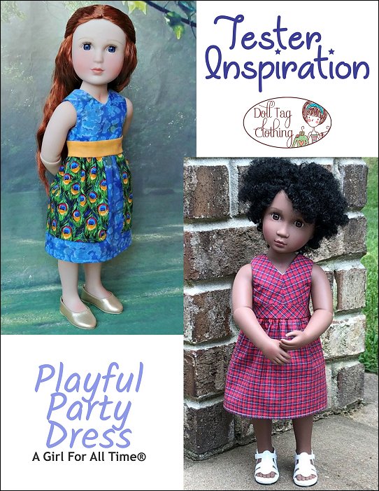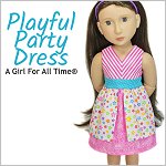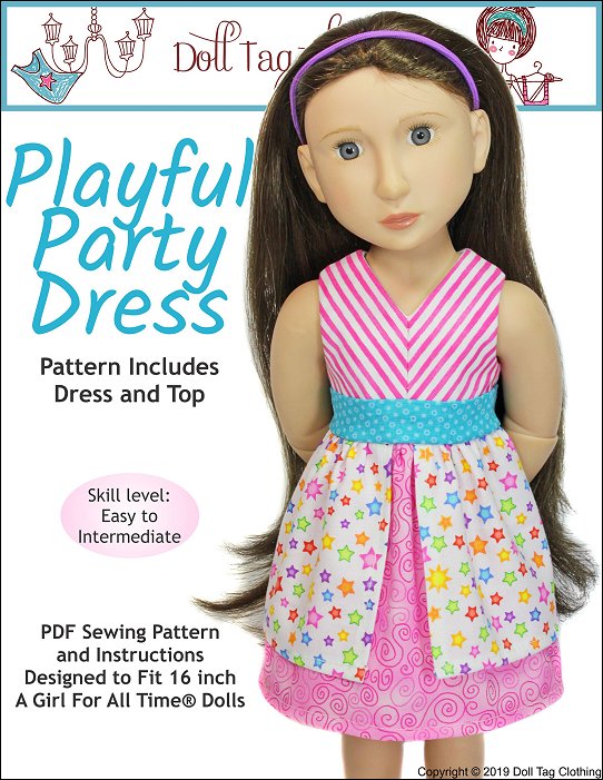 Fun and playful! This is a basic party dress with V-neck front that can be cute with mitered stripes or just plain. The dress is finished with a waistband and the skirt has two layers with the top layer having a split front.Play with fabric and color to create a whole range of dresses with this quick to sew PDF Sewing pattern.Options Include:* Sew the dress without the overlay for a different look* Top pattern and instructions included!Doll Size: 16 inch such as A Girl for All TimeMaterials:- Light to medium weight fabric such as quilters cotton