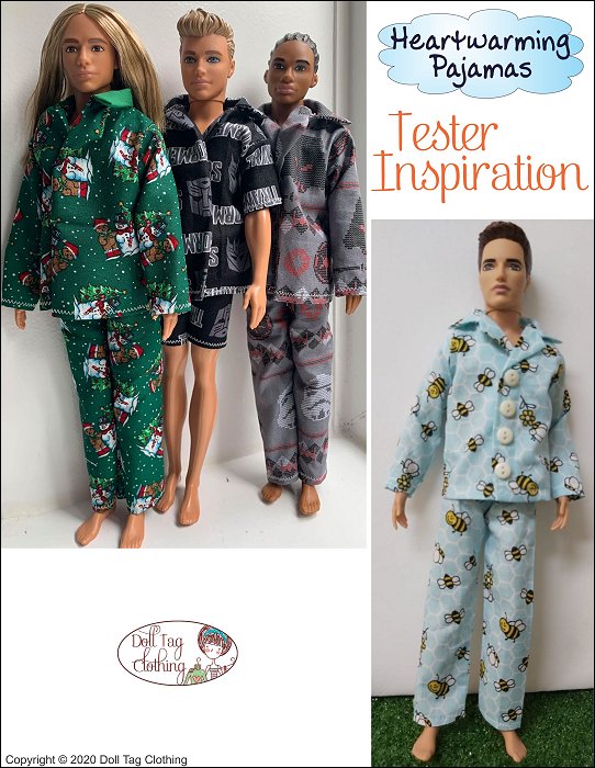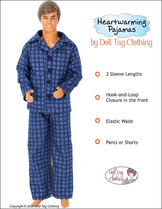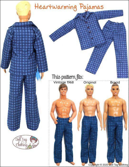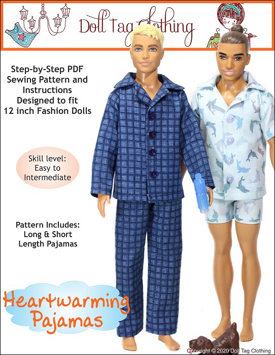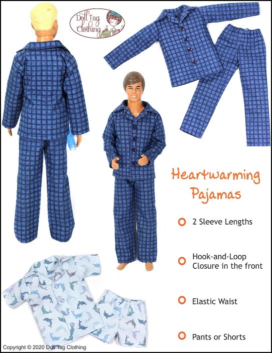 Traditional style pajamas to keep your doll warm and cozy. The jacket has a simple collar with hook-and-loop front closure for easier doll play. Snaps can also be used. The buttons make the pajamas look more authentic.The pants have an elastic waist.Use cotton woven fabric to make your pajamas. Included is a short sleeve with shorts option. Doll Size:12 inch male fashion dollsFit is confirmed on the following dolls:Vintage 1968— Body used through the 1980’s. 1968 stamped on backOriginal Body — Regular modernBroad Body — Modern