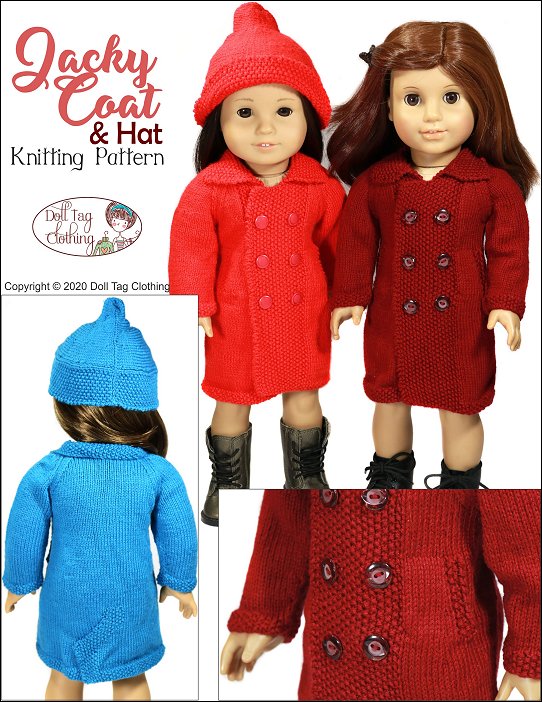 Knitting pattern to create a classy coat with hat for your 18 inch doll. The coat has a double breast opening in the front, collar and finished with two pockets. At the back there is a placket for more detail. This coat is knitted with a fine yarn and needles so that your end result is a fine knit that is doll scale.The coat is knitting from the hem up to the shoulders.Doll Size: 18 inch Dolls such as American Girl®You Will Need* Yarn Amount — 2x 50gr (Coat and Hat)* Needles – Size 2.75 (2 US) straight and/or circular and double pointed needles* 3/8” Wide Buttons — x6Yarn Options** Sport Weight and Fingering Weight – 4 PlyKnitPicks® Special Reserve Stroll Brights Fingering — RuzzleberryKnitPicks® Comfy Fingering Weight — HollyberryELLE® Family Knit Classic 4 Ply — Red