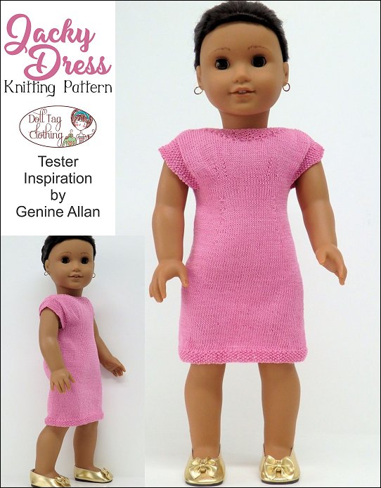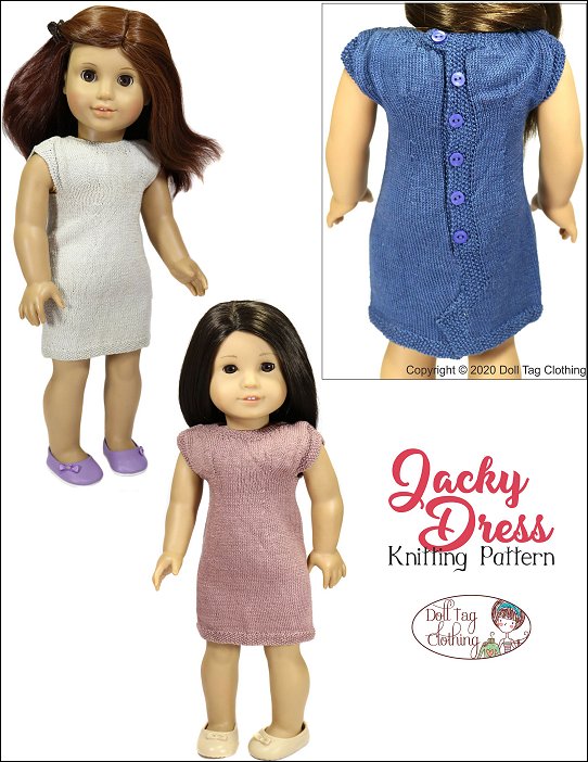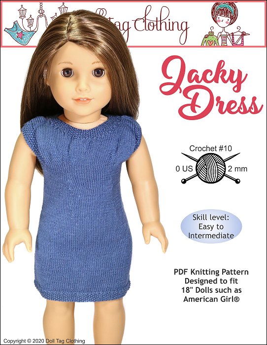 Knitting pattern to create a classy dress for your 18 inch doll. The dress is short sleeve with a slit in the back. It closes with a row of buttons.This dress is knitted with a fine yarn and needles so that your end result is a fine knit that is doll scale. The dress is knitting from the hem up to the shoulders.Doll Size: 18 inch Dolls such as American Girl®You Will Need:* KnitPicks® — Crochet Cotton No 10 (Colors used — Neutral, Teal) Amount Needed — About 35 gr to complete* Used by Tester — Rico® Essential Crochet Cotton* Needles — 2 mm (0 US) circular and double pointed needles* 3/8” Wide Buttons — x6* Optional: Embellishments such as ribbons or extra buttons for the front