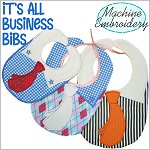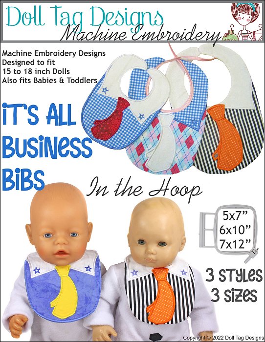 MACHINE EMBROIDERY Design SetSweet machine embroidery bibs for 15” to 18” baby dolls. This bib sports a shirt with collar look as well as a tie. All done in appliqué in the hoop.This set includes 1 design in 3 styles:1. Complete in the hoop and sew bias binding on the neckline with sewing machine.2. Complete in the hoop, turn and add a snap or ribbon.3. Complete in the hoop and add snap. The bib has satin stitch edge.Design Hoops and Sizes:- 5x7” - Doll Size- 6x10” & 7x12” - Baby and Toddler