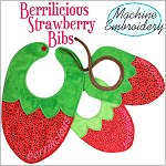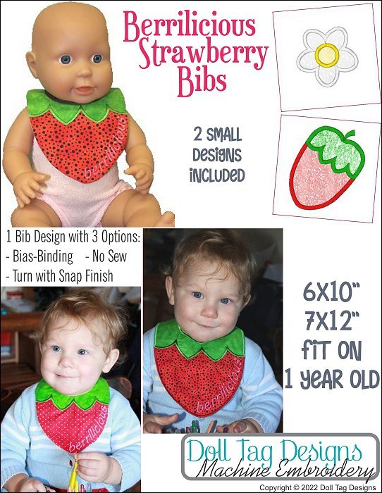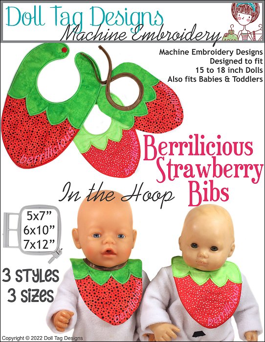 MACHINE EMBROIDERY Design SetSweet machine embroidery bibs for 15” to 18” baby dolls. This bib is the shape of a delicious strawberry. All done in appliqué in the hoop.This set includes 1 design in 3 styles:1. Complete in the hoop and sew bias binding on the neckline with sewing machine.2. Complete in the hoop, turn and add a snap or ribbon.3. Complete in the hoop and add snap. The bib has satin stitch edge.Design Hoops and Sizes:- 5x7” - Doll Size- 6x10” & 7x12” - Baby and Toddler
