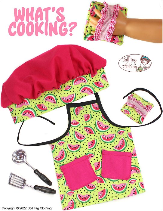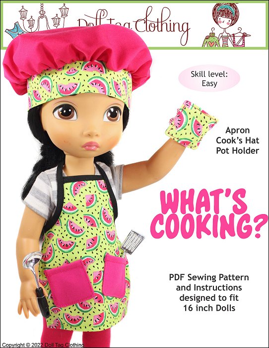What's Cooking? A fun Sewing pattern to create a cooking and baking set.Pattern Includes:~ Apron~ Cook's Hat~ Pot HolderDoll Size:16 inch Animator Dolls