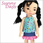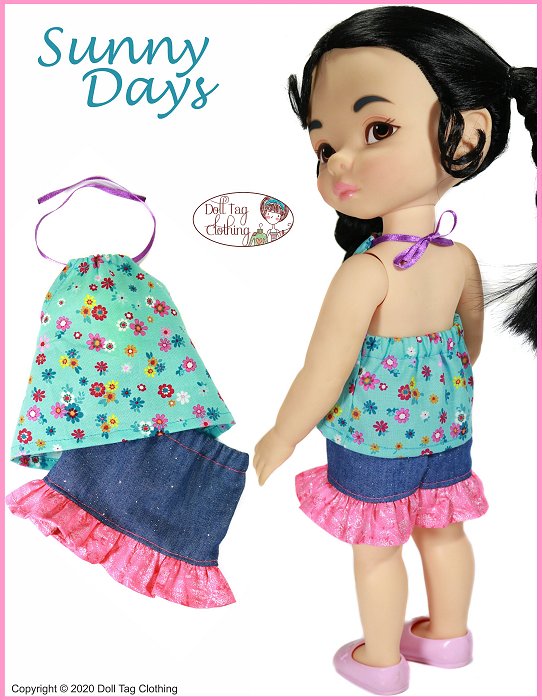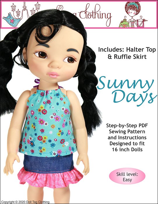 Sunny Days is quick and easy to sew. Create a fun outfit including a halter top with ribbon ties and ruffle skirt with elastic waist.Doll Size:16 inch Animator DollsFabric GuideSkirt — Medium weight woven fabric like cotton and quilt cotton.Top — Light weight woven fabric or t-shirt knit.You will needFabric1/8” Wide Ribbon1/4” Wide Elastic