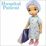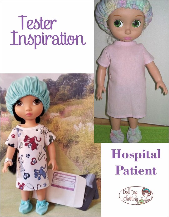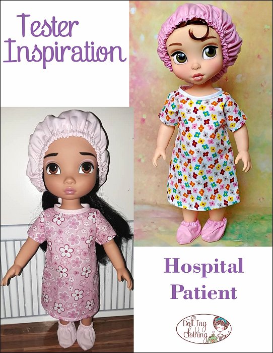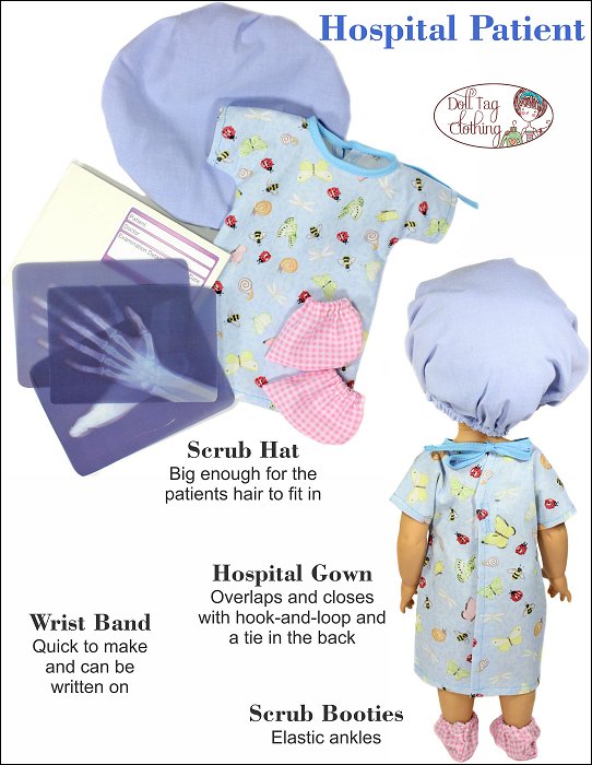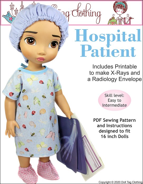 Your doll will become the cutest patient around with this adorable sewing pattern! This hospital gown is made with an overlap in the back that closes with hook and loop and bias binding ties so there is no wide open gap. If your doll needs to go to surgery she will also need a scrub hat and some booties! And don’t forget her wrist band for you to write her name on! It is made from vinyl and is so quick to make so you can make a few in a matter of minutes.There is also a fun Doll Play printable added! Print the X-Rays on Vellum paper or transparencies for a “real” x-ray look. The envelope is printed onto cardboard, folded and glued. There is space on the front for the patient's details to be written on.Doll Size:16 inch Animator DollsYou Will Need:• Fabric 1 – Hospital Gown — 9.5” x 19”• Fabric 2 – Cap and Booties — 12” x 20”• Vinyl for wrist band — Remnant• Bias Binding — 18”• Hook-and-Loop Tape — 1”• Narrow Elastic (1/4” wide) — 16”