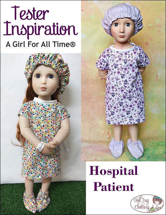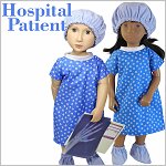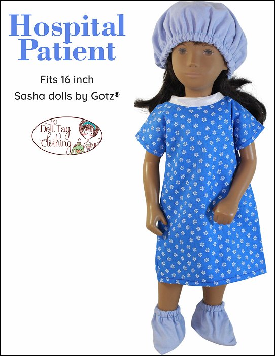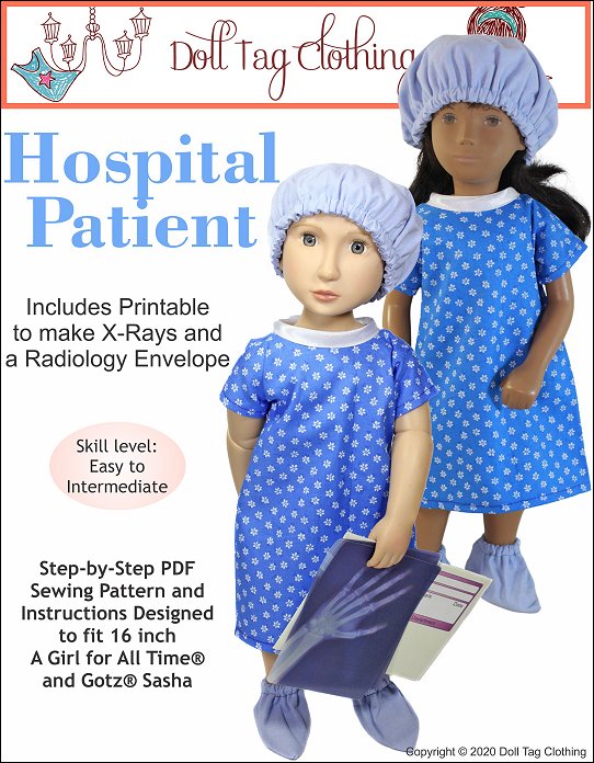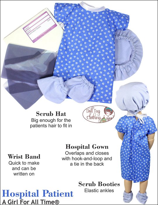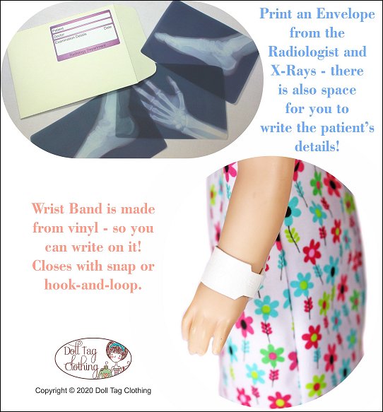 Your doll will become the cutest patient around with this adorable sewing pattern! This hospital gown is made with an overlap in the back that closes with Velcro and bias binding ties so there is no wide open gap. If your doll needs to go to surgery she will also need a scrub hat and some booties! And don’t forget her wrist band for you to write her name on! It is made from vinyl and is so quick to make so you can make a few in a matter of minutes.