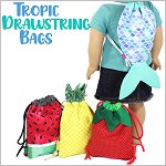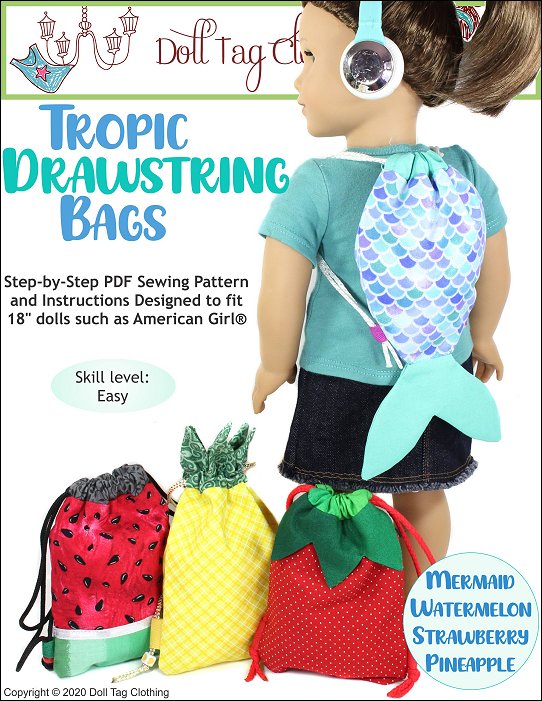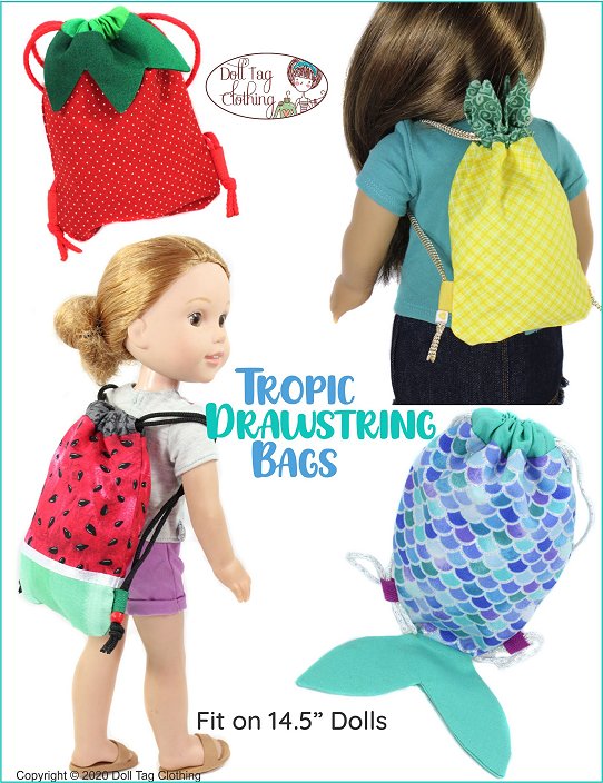These drawstring bags are super cute for summer fun! The drawstring bag can be worn as a backpack for back to school. There are four different bags that you can make - watermelon, strawberry, pineapple or mermaid tail. Play with fabric and you can have even a bigger variety of bags!At skill level "Easy" anyone can make these! They are quick to sew and great if you want to make a whole bunch!Doll Size: Designed for 18 inch dolls but are suitable for 14 to 20 inch dolls.You will Need:• Fabric Type — Medium weight Cotton. Quilters Cotton. Sheeting• Ties — Cord, String or Ribbon — 1/8” wide• Trim for Side Tabs — Grosgrain ribbon, tape or ribbon — 1/2" wide