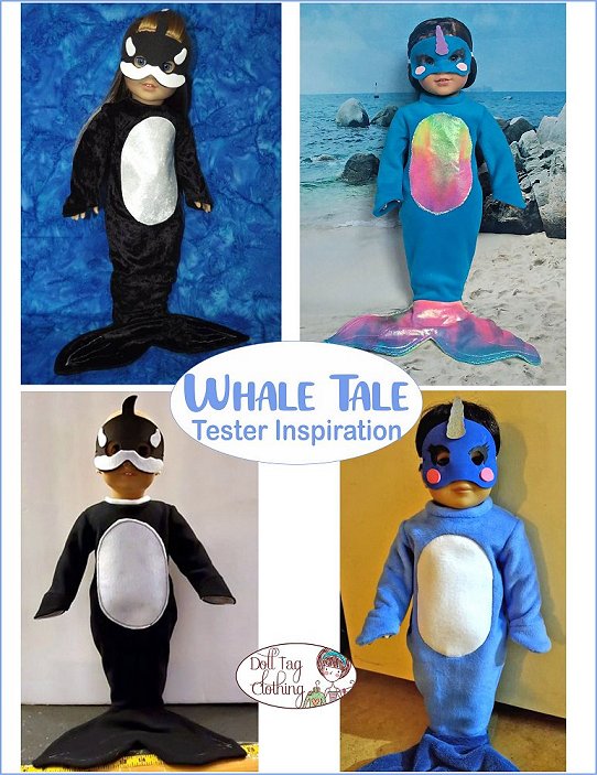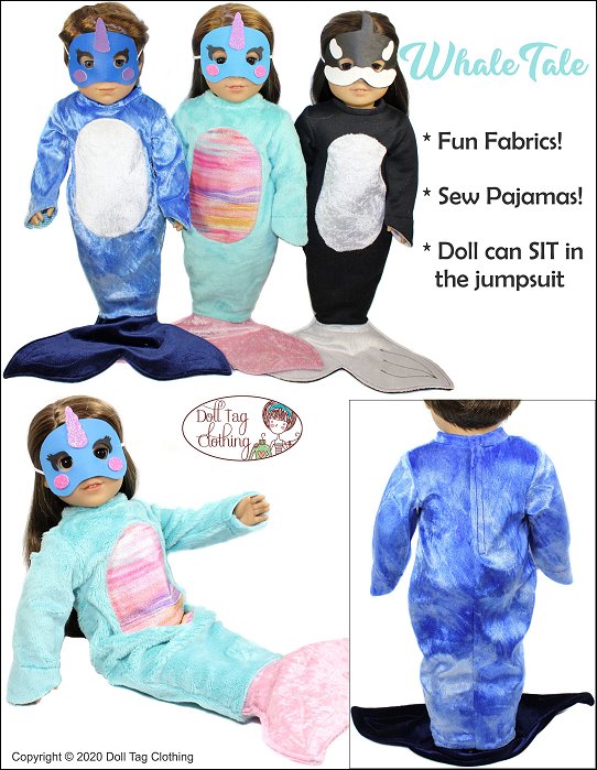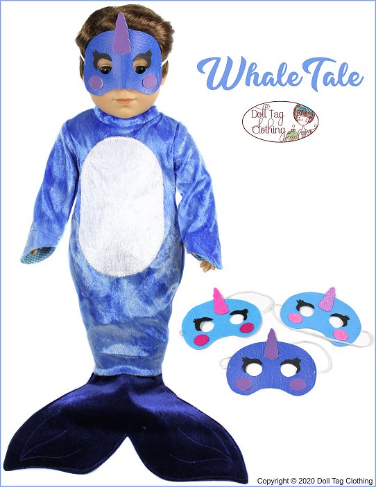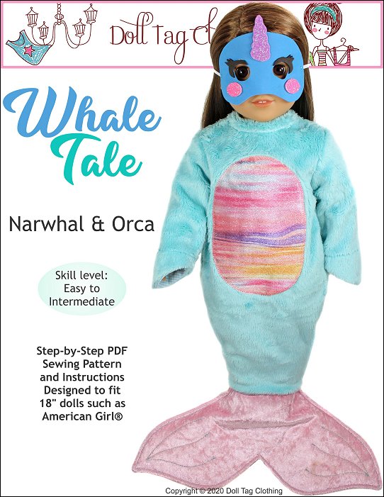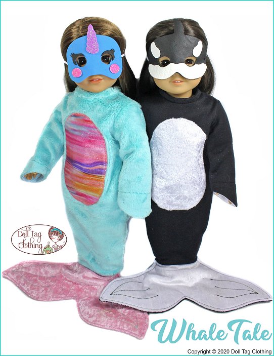 Included are the pattern pieces and instructions to create two different masks, Narwhal and Orca. They can be made from craft foam, felt or vinyl.Doll Size: 18 inch dolls such as American GirlWhale Suit Fabric & Supplies• Fabric — Main Costume — 17” x 29”• Fabric — Sleeve Lining — 5” x 5”• Fabric — Fluke — 12.5” x 13”• Fabric — Tummy Appliqué — 4.5” x 6.5”• Thin Batting OR Felt for flukes — 12.5” x 6.5”Mask Supplies• Felt OR thin craft foam Remnants• 1/4" Wide Elastic — 8”