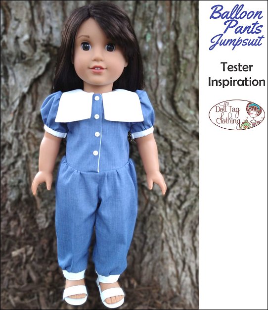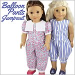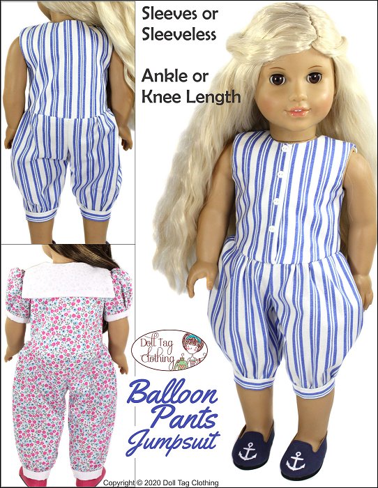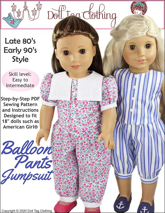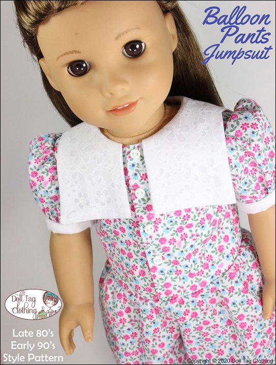 This jumpsuit is full of late 80’s and early 90’s inspiration complete with a large square collar and puffy sleeves. The jumpsuit has a curved waistline and the pants slightly gathered to give the balloon style. It closes in the front with snaps and the buttons are for decoration. The sleeves and leg hems are finished off with cuffs. The bodice is fully lined.With this sewing pattern you can create different jumpsuits. With sleeves or sleeveless, ankle or knee length.Doll Size: 18 inch dolls such as American GirlYou Will Need:• Fabric — 16” x 32”• Fabric Collar & Cuffs — 7” x 21” • Lining — 7” x 16”• Buttons — 1/4" wide — x4• Hand Sew Snaps — 1/4" wide — x4