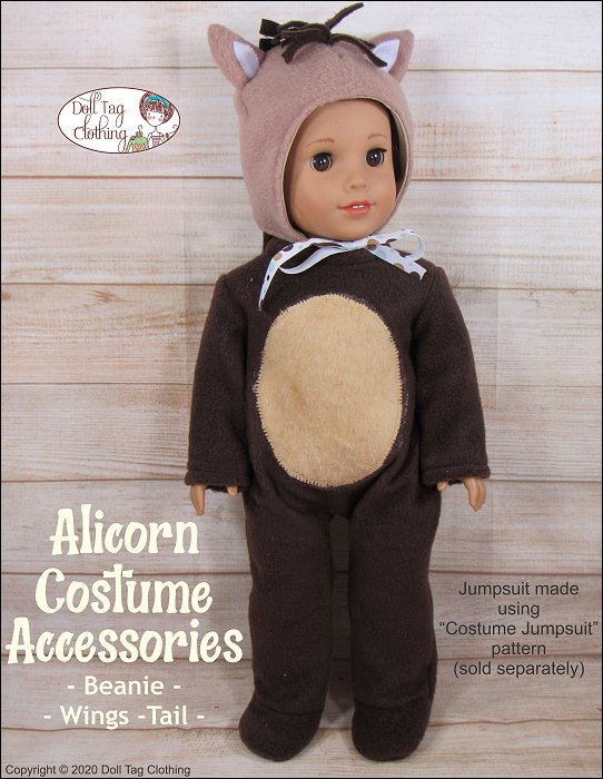 Included in this pattern is a beanie and wings. The beanie can be made with or without the horn for a horse or unicorn. It finishes with a ribbon tie under the chin or you can add cord for sparkle pom-poms. The wings are made from craft foam or felt. Elastics are attached for the doll to wear the wings over her shoulders.Added is a tutorial to create and attach a tail to a costume of your choice.Add the accessories in this pattern - beanie, tail and wings - to your favorite outfit to create a character. It can be a dress, jumpsuit or leotard!Doll Size: 18 inch dolls such as Our Generation or American GirlFabric GuideMinky, Cuddle Fleece, Micro Fleece, Anti-pill Fleece or Fleece. Tracksuit Fabric