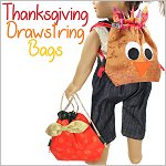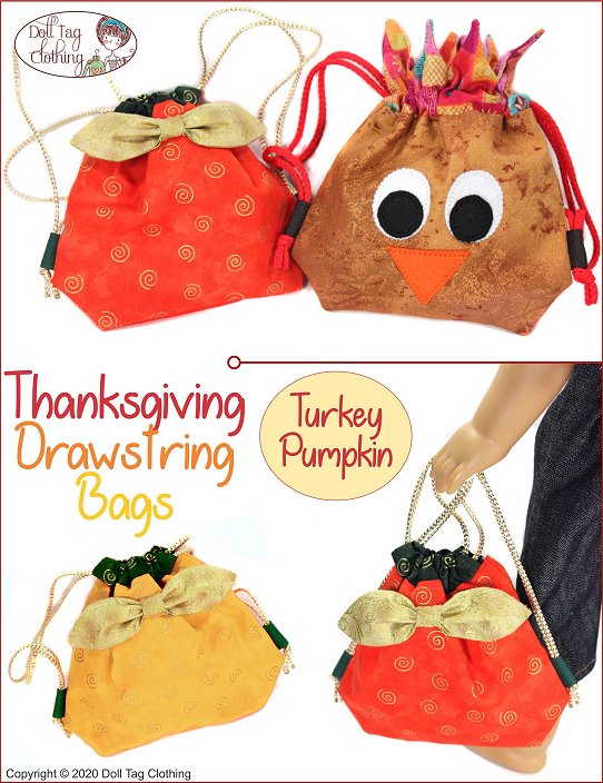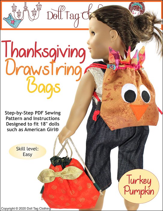 Adorable themed drawstring bags for fall and thanksgiving. The shape of these bags are rounder and fuller for a really pumpkin and turkey look!The drawstring bag can be worn as a backpack for back to school or a family outing.There are two different bags that you can make – pumpkin or turkey. Play with fabric and you can have a bag for a different season.At skill level "Easy" anyone can make these! They are quick to sew and great if you want to make a whole bunch!Size:These bags are designed for 18 inch dolls but are suitable for 16 to 20 inch dollsYou will Need:• Fabric Type — Medium weight Cotton. Quilters Cotton. Sheeting.• Ties — Cord, String or Ribbon — 1/8” wide• Trim for Side Tabs — Grosgrain ribbon, tape or ribbon — 1/2" wide