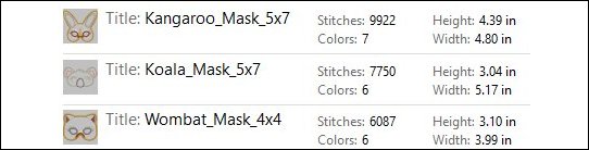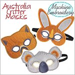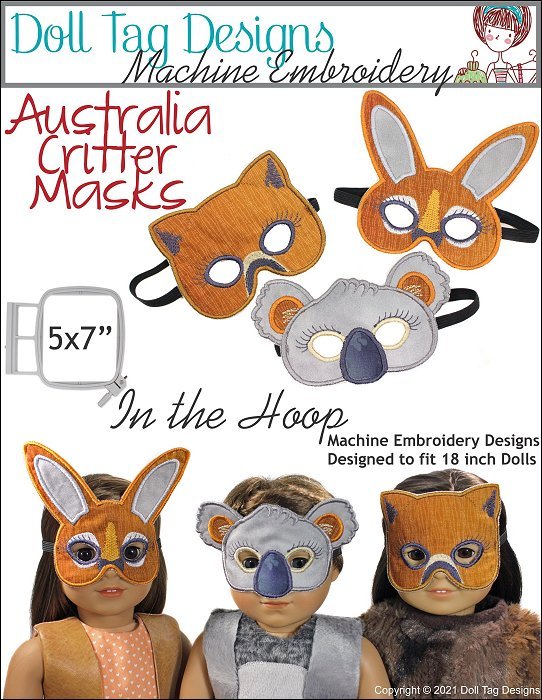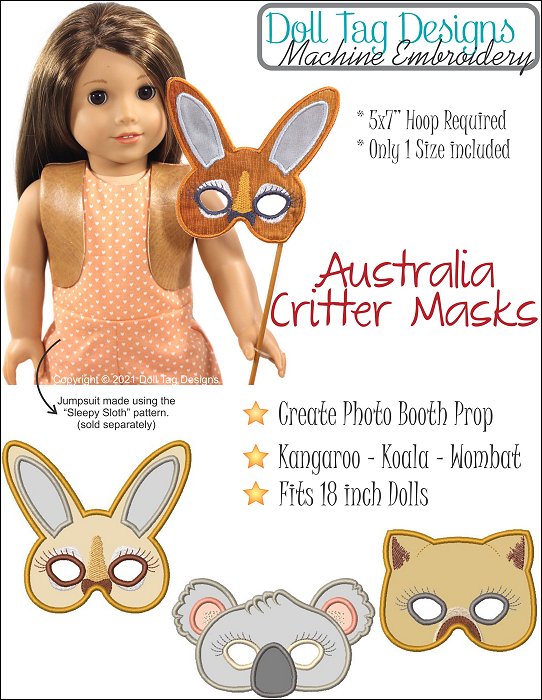 MACHINE EMBOIDERY DesignsThese machine embroidery masks are perfect for a dress-up theme! Add a cute jumpsuit or pretty dress and you have a fun and playful costume!You get 3 Animal Masks to embroider in the hoop for your 18" Doll or all medium sized dolls: Kangaroo - Koala - Wombat.The masks are completed in the hoop and elastic is added afterward with a sewing machine or by hand.Design Hoops and Sizes: 5x7" Hoop NeededKangaroo_mask_5x7 - 121.90x111.60 mmKoala_mask_5x7 - 131.30x77.20 mmWombat_mask_4x4 - 101.20x78.80 mmMachine Formats: ART5; DST; EXP; HUS; JEF; PES; VIP; VP3; XXXBuy the Sleepy Sloth costume pattern separately
