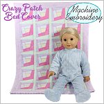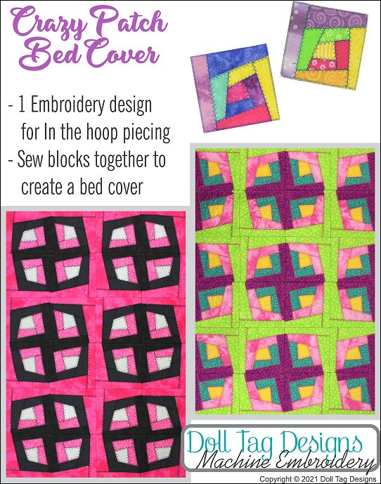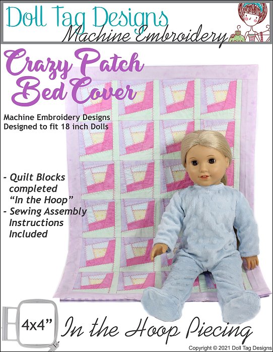 MACHINE EMBROIDERY DesignsCreate a doll size quilt block “In the Hoop” of the embroidery machine. The piecing of the block is completed in the hoop as well as the top stitching on the block.Complete enough blocks to create your doll cover. Sew the blocks together on your sewing machine. Then add a border, some batting and lining and your bed cover is complete!Included is a PDF file that shows the step-by-step embroidery instructions as well as the assembly instructions for the bed cover.The bed cover on the cover for the 18 inch dolls measures 17” x 22”. You can create any doll size quilt by changing the amount of blocks you embroider.Design Hoops and Sizes: 4x4" Hoop NeededMachine Formats: ART; DST; HUS; EXP; JEF; PES; VIP; VP3You Will Need:BLOCKS — 9 Shades of bright fabric — Remnants or about 7x7” of each colorSTRIPS — 8” x 18” or Fat Eighth (half a fat quarter)LINING — 17” x 23”BATTING / FLANNEL — 17” x 23”Tear-Away Stabilizer — 28” x 40” (24x 4x4” hoopings)