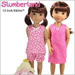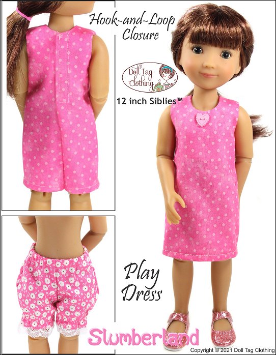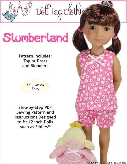 Sew cute pajamas for your 12 inch doll with this pattern. The pattern includes an A-line top with a hook-and-loop closure in the back. The bloomer shorts have elastic cuffs and you can add lace or leave it off.Pattern pieces have been added for you to sew a simple A-line, knee length dress.Dolls Size: 12 inch dolls such as Siblies™Materials: Light to medium weight woven fabrics like quilt cotton, cotton and shirting.You Will Need:Fabric for Top and Pants — 9” x 17” (Includes lining)Fabric for Dress — 10” x 11” (Includes lining)2.5” Hook-and-loop binding12” Elastic (1/4” wide)