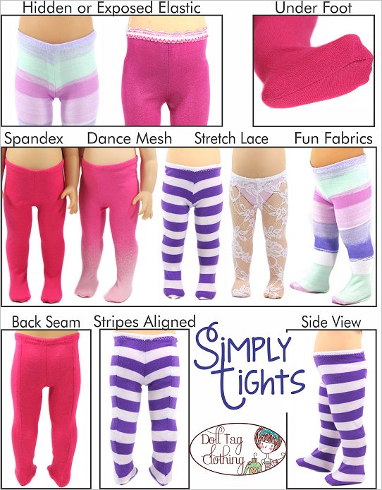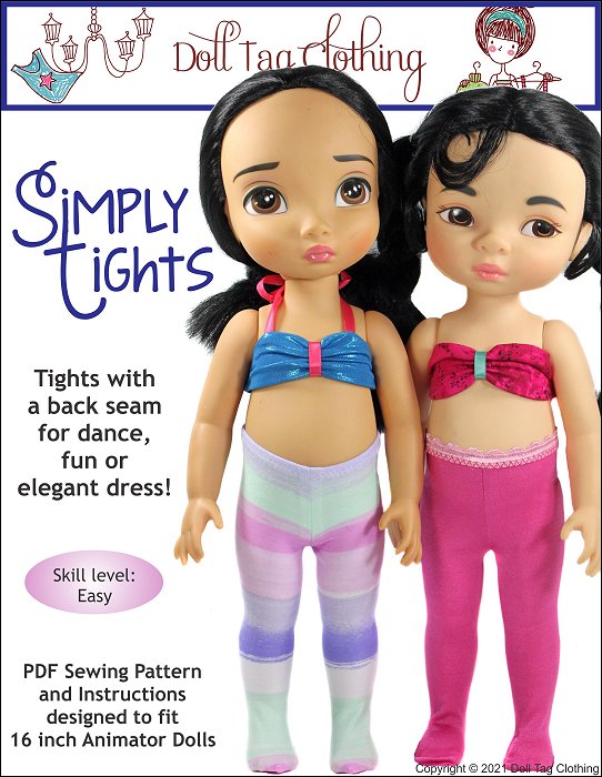 Make trendy, fun, elegant or dance tights for your 16 inch Animator doll. These tights have a seam at the back, which helps minimize the bubbles over the bridge of the doll's foot without adding an extra dart. Use any type of knit or stretch fabric - spandex, dance mesh, stretch lace and more. Included are 2 pattern options to accommodate normal stretch fabrics or those that stretch even more! Also included in this PDF pattern are 2 methods for adding the elastic - either an exposed elastic or a hidden one.Doll Size:16 inch Animator DollsMaterials: Light weight knitted and stretch fabrics. Stretch lace, dance mesh, spandexYou Will Need:- Fabric for tights - Narrow Scallop edge or flat Elastic (5/8” to 1/2” wide)
