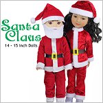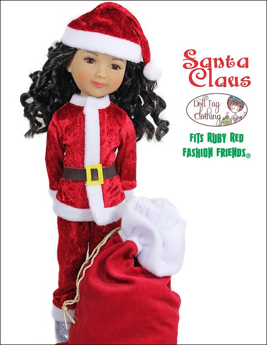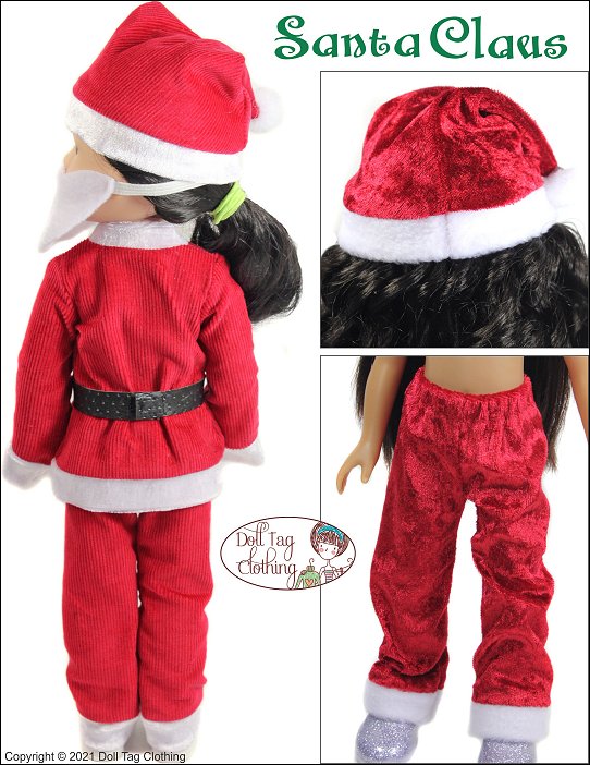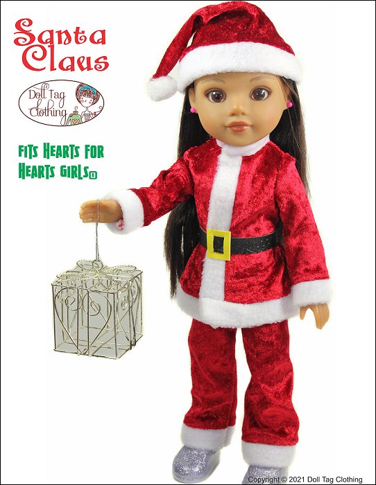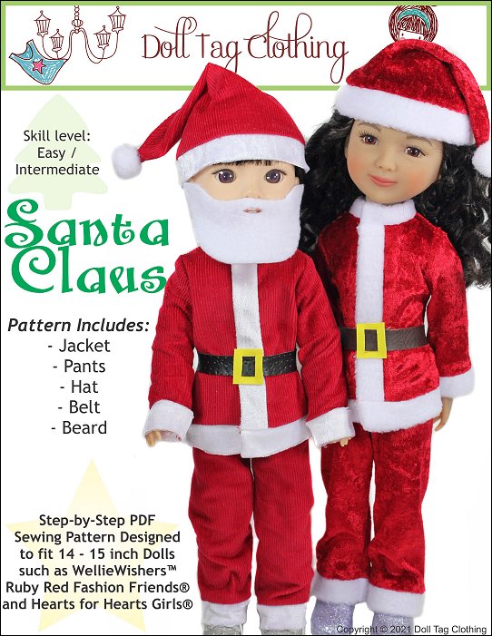 Ho Ho Ho! Make a jolly Santa suit for Christmas with the festive pattern. Play with different fabric textures for different looks. The pattern also includes an easy to make beard! The jacket is closed with snaps in the front. The pants have an elastic waist. The belt closes with hook-and-loop in the back.Doll Size: 14 to 15 inch dolls such as WellieWishers, Ruby Red Fashion Friends and Hearts for Hearts.Materials: Woven fabrics. Look for fabric that has a bit of texture for a more authentic look. Velvet is a little harder to work with so is not advised for beginners. Look around the fabric store and see what nice red fabric you can find.• Santa Suit Red - Thin Velvet, Velour, Crushed Velvet, Cotton, Light weight denim or corduroy, Velveteen• White Trim – Fun Fur with short pile, Furry fleece, Velvet, Crushed Velvet, Minky, Terry Cloth• Belt – Black and Brown Vinyl for the belt and brown or yellow for the buckleYou Will Need:-Red Fabric – Jacket, Pants, Hat – 19 x 44”-White Fabric – 13 x 22”-Vinyl for Belt – Remnants-Fusible Interfacing - Remnant-4 Clear plastic sew on snaps – Size 3 (5/8”)-White 1” pom-pom or felt ball-10.5” Elastic (3/8”) for waist-6” Elastic (1/4”) for beard-½” Velcro to match the vinyl belt