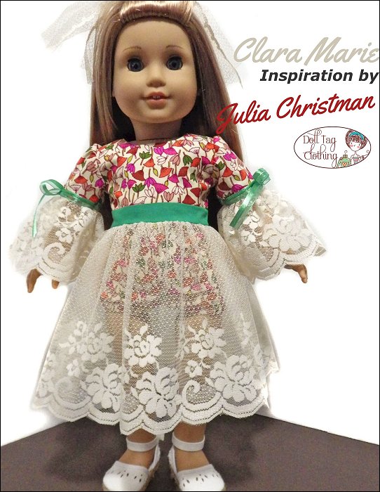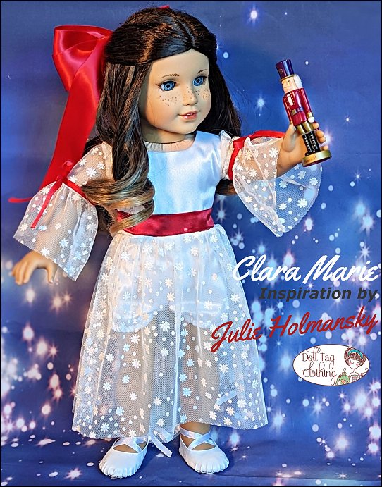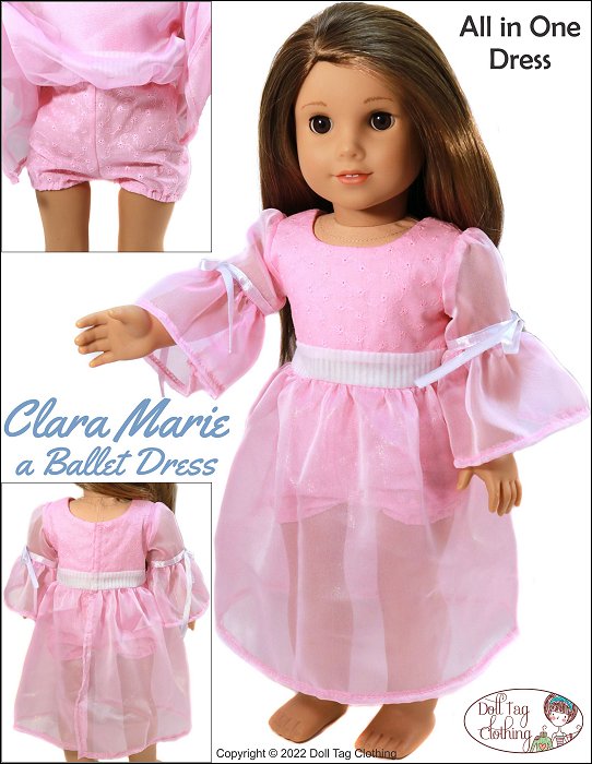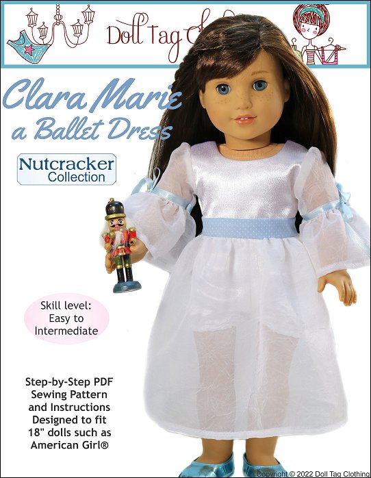 Sew a Nutcracker Ballet inspired dress with this pattern designed by Doll Tag Clothing for 18 inch dolls.This is an “all in one” dress that includes a waistband and a bloomer short underneath the skirt. The bodice is fully lined and it closes with hook-and-loop in the back. The sleeve is made in two parts and finished with ribbon and a bow. There are small gathers at the shoulder. The legs of the shorts are finished with an elastic in a casing.The dress is designed for woven fabrics and looks beautiful when you use a sheer fabric for the sleeves and skirt.This dress is designed to fit soft body 18 inch dolls such as American Girl.
