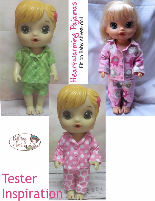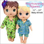 Winters are cold and the perfect pajama set! Sew warm and cozy pajamas with this pattern. The top closes with hook-and-loop in the front and buttons sewn on the top. The pants have an elastic waist.Included is short and long sleeves and pants for winter or summer! These are also perfect to make for boy dolls.Dolls Size: 11 inch (Small) and 12-13 inch (Medium) dolls such as Baby Alive® by Hasbro™Materials: The pajamas are made from cotton or light weight flannel.Skill Level: The pajamas are easy to sew but due to the size the collar needs careful sewing.