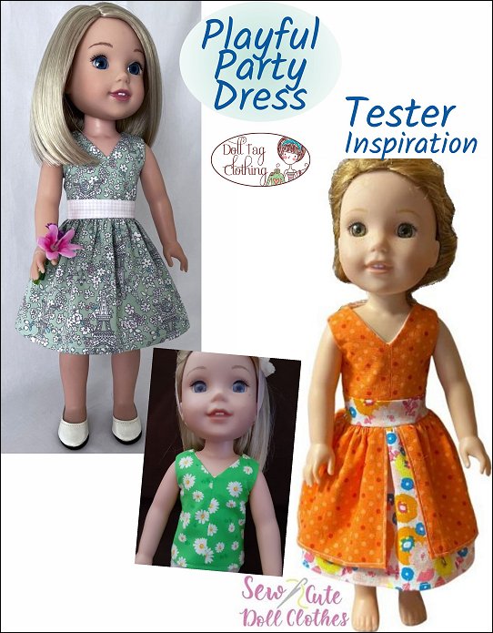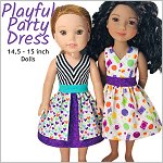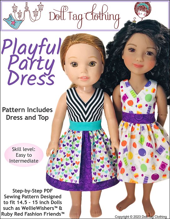 Fun and playful! This is a basic party dress with V-neck front that can b cute with mitered stripes or just plain. The dress is finished with a waistband and the skirt has two layers with the top layer having a split front. Closes with hook-and-loop in the back.Play with fabric and color to create a whole range of dresses with this quick to sew PDF Sewing pattern.Options Include:* Sew the dress without the overlay for a different look* Top pattern and instructions included!Fits:14.5 - 15 inch dolls such as WellieWishers and Ruby Red Fashion FriendsAlso fits - Melissa and Doug Mine to Love and Glitter Girls.Skill Level: Easy to IntermediateMaterials:- Light to medium weight fabric such as quilters cotton