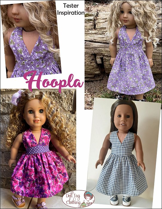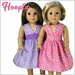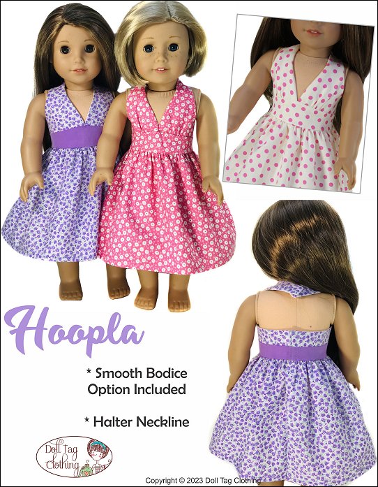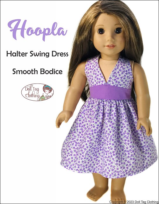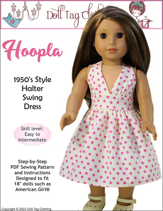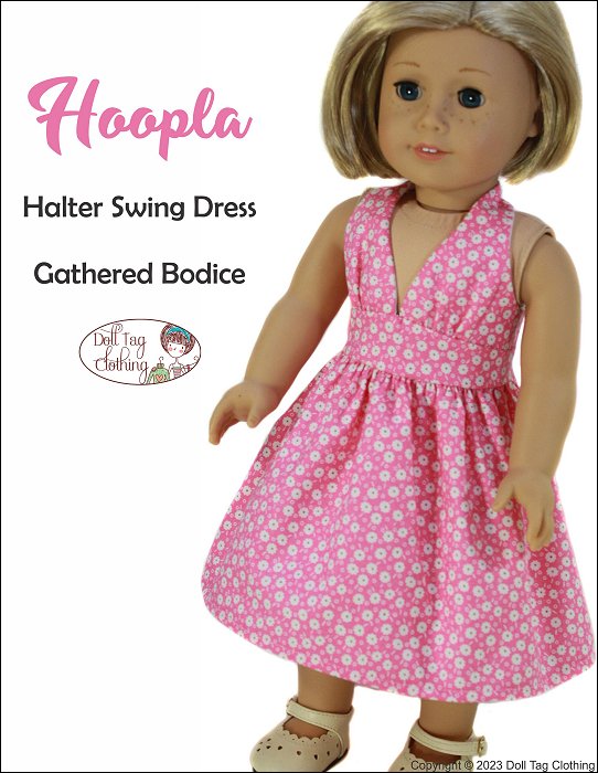 Hoopla is a 1950’s inspired halter swing dress. The halter bodice closes with a snap at the back of the neck and hook-and-loop at the back of the waist and waistband. The waistband is broad and has an upward point in the front. The skirt is nice a full with gathers which is a feature of the swing dress.There are two bodice options included in the pattern. Smooth front or a gathered front. The bodice and waistband are fully lined.Pattern is designed to fit 18 inch soft body doll such as American Girl.You Will Need:• Main Fabric — 14” x 29”• Lining — 7” x 14”• Hook-and-loop Tape — 2”• Snap: Hand Sewn 1/4" wide — x1